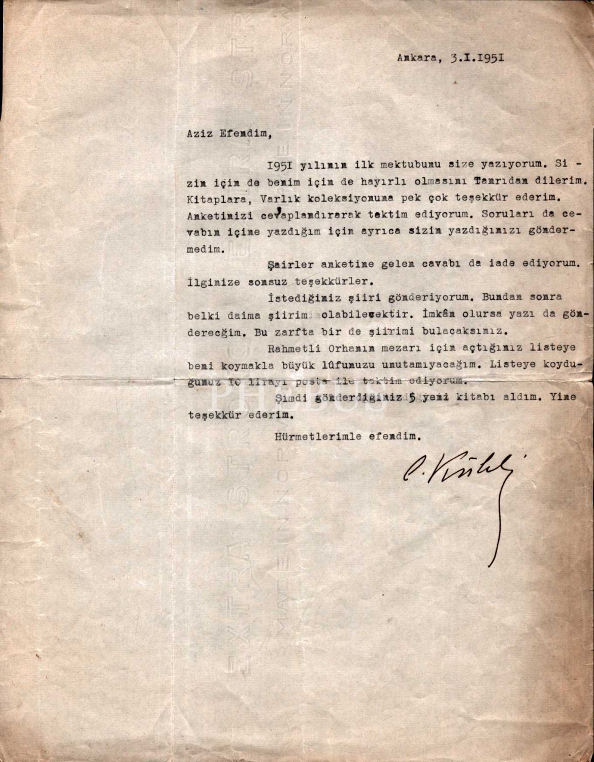 Şair Cahit Külebi´den Yaşar Nabi Nayır´a Orhan Veli´nin mezarı konulu mektup, 3 Ocak 1951, 23x30 cm