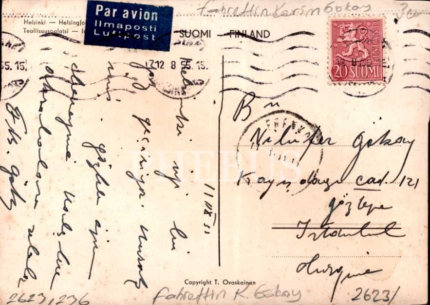İstanbul vali ve belediye reisi Ord. Prof. Dr. Fahrettin Kerim Gökay´dan eşi Nilüfer Gökay´a gönderilmiş kartpostal, 10x15 cm