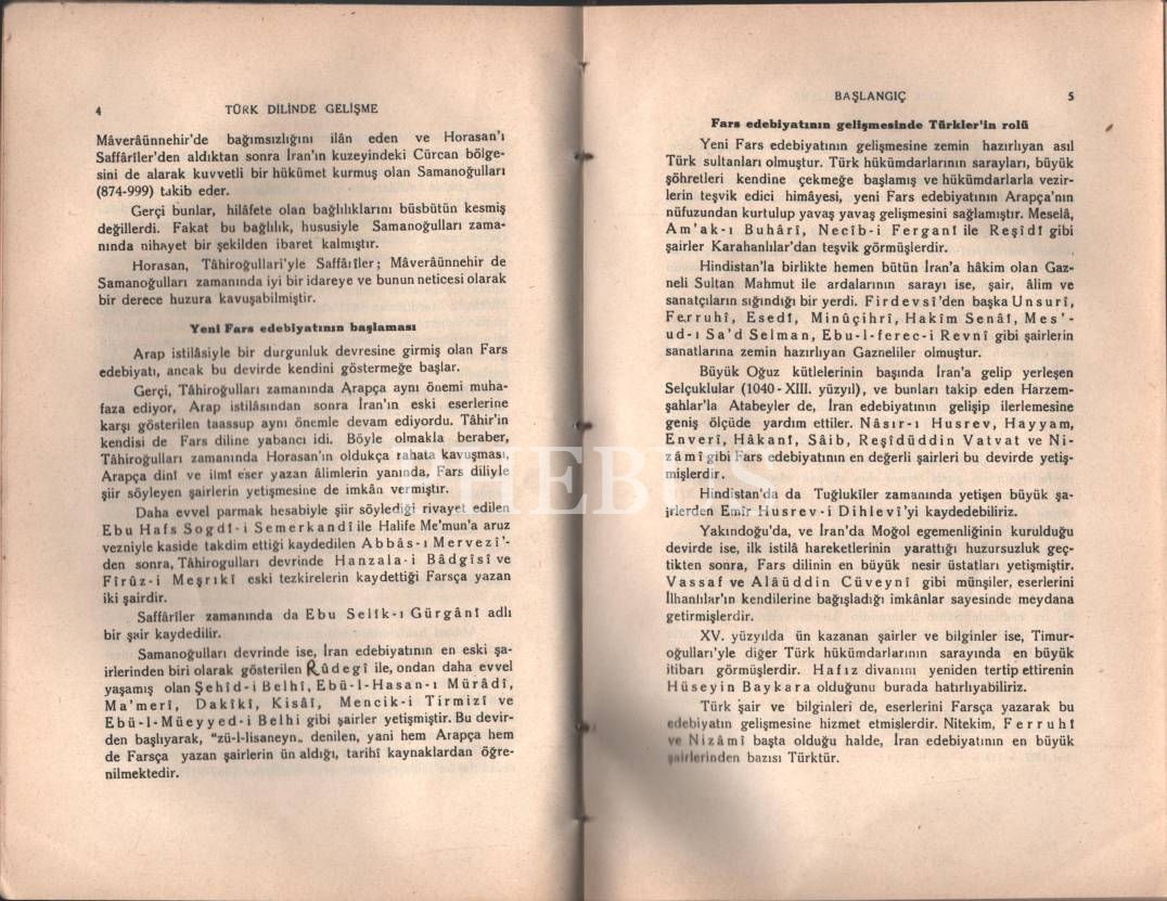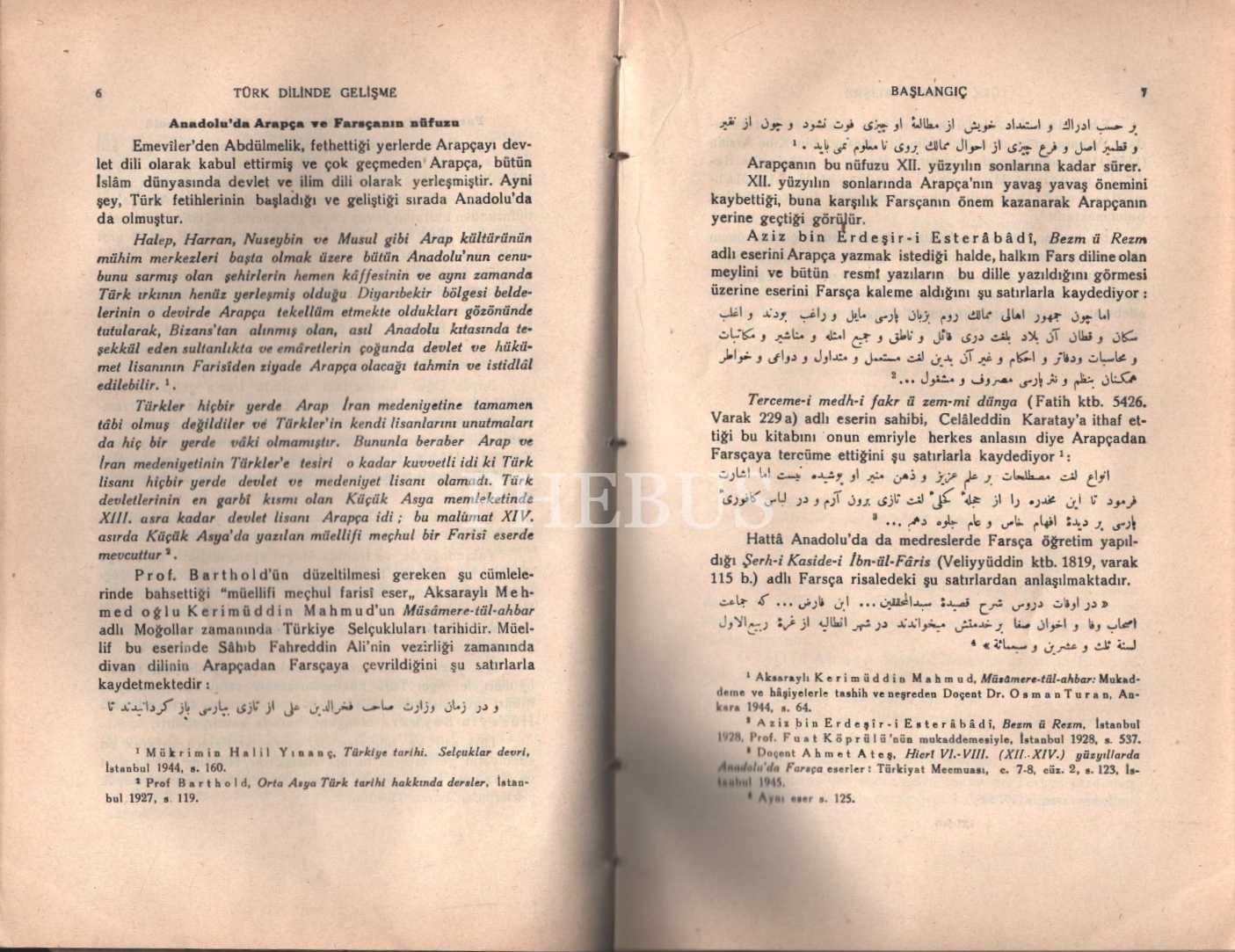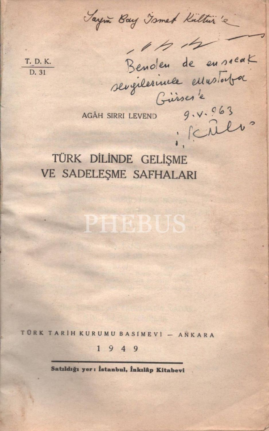 Agâh Sırrı Levend´den ithaflı ve imzalı TÜRK DİLİNDE GELİŞME VE SADELEŞME SAFHALARI, Türk Tarih Kurumu Basımevi, Ankara - 1949, 426 s., 16x24 cm
