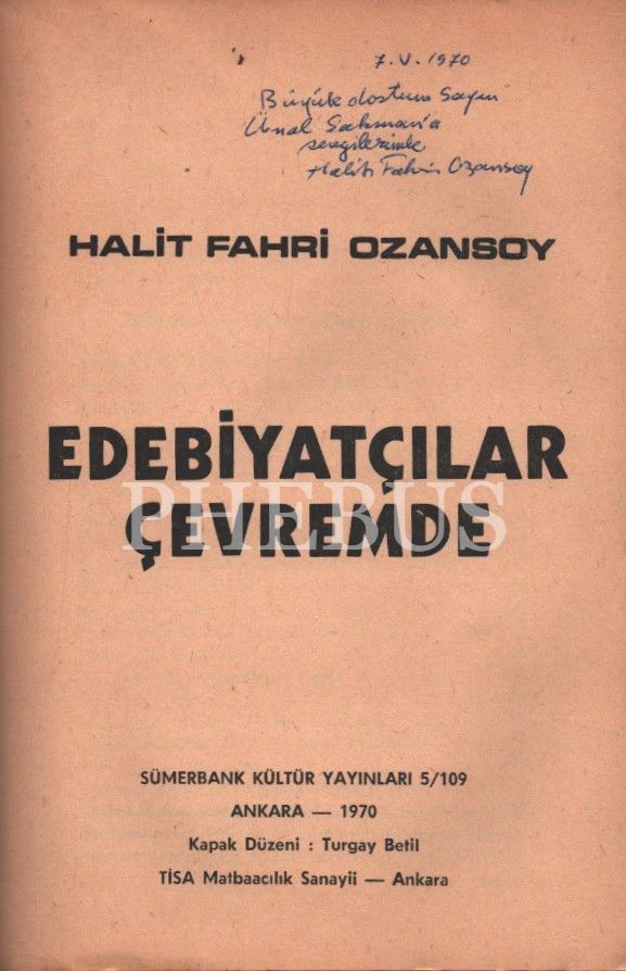 Halit Fahri Ozansoy´dan ithaflı ve imzalı EDEBİYATÇILAR ÇEVREMDE, Sümerbank Kültür Yayınları, Ankara - 1970, 373 s., 13x20 cm