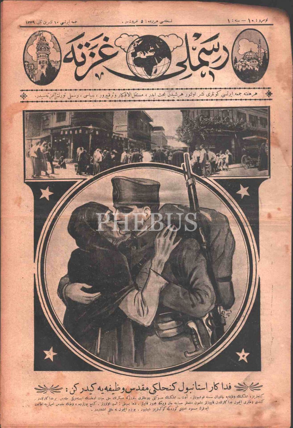 Her şeyden bahseden terakkiperver, siyasi RESİMLİ GAZETE´nin "Fedakar İstanbul Gençliği Mukaddes Vazifeye Gidiyorken:" başlıklı 10. sayısı, 1 Teşrinisani 1339, 27x40 cm