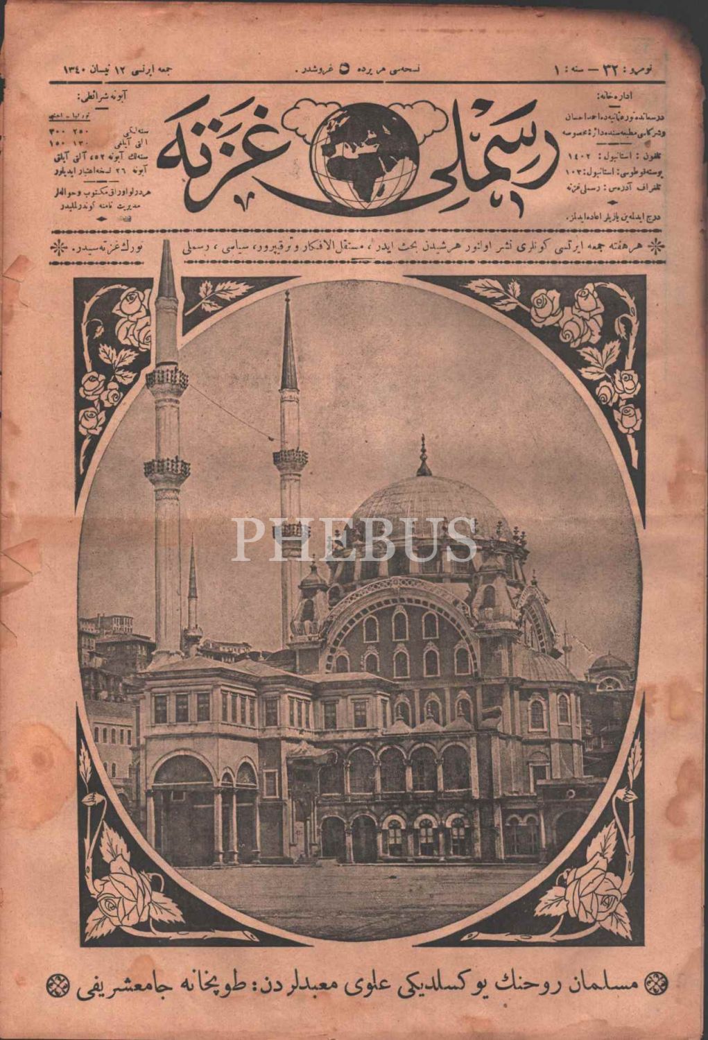 Her şeyden bahseden terakkiperver, siyasi RESİMLİ GAZETE´nin Tophane Cami görselli 32. sayısı, 12 Nisan 1340, 27x40 cm
