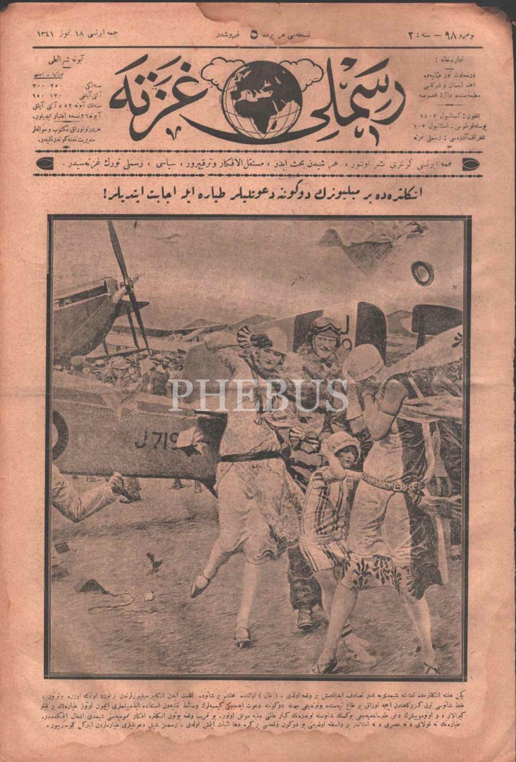 Her şeyden bahseden terakkiperver, siyasi RESİMLİ GAZETE´nin Tayyere görselli 98. sayısı, 18 Temmuz 1341, 27x40 cm