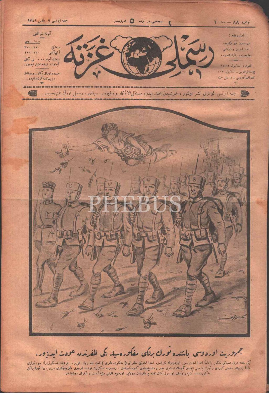Her şeyden bahseden terakkiperver, siyasi RESİMLİ GAZETE´nin "Cumhuriyet Ordusu Başında Türk Birliği Mefkuresiyle Yeni Zaferinden Avdet Ediyor" başlıklı 88. sayısı, 9 Eylül 1341, 27x40 cm