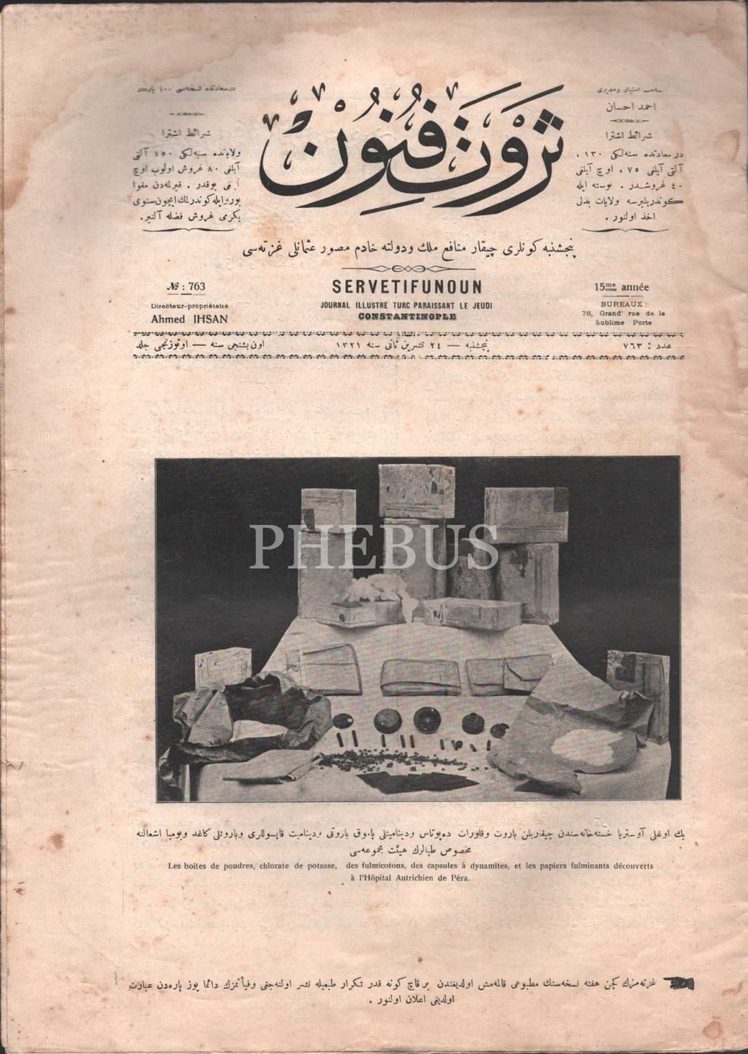 SERVET-İ FÜNUN dergisinin Beyoğlu/Avusturya Hastanesinden Çıkarılan Barut ve Topların fotoğrafına dair kapak görselli 763. sayısı, 24 Teşrinisani 1321, 24x32 cm