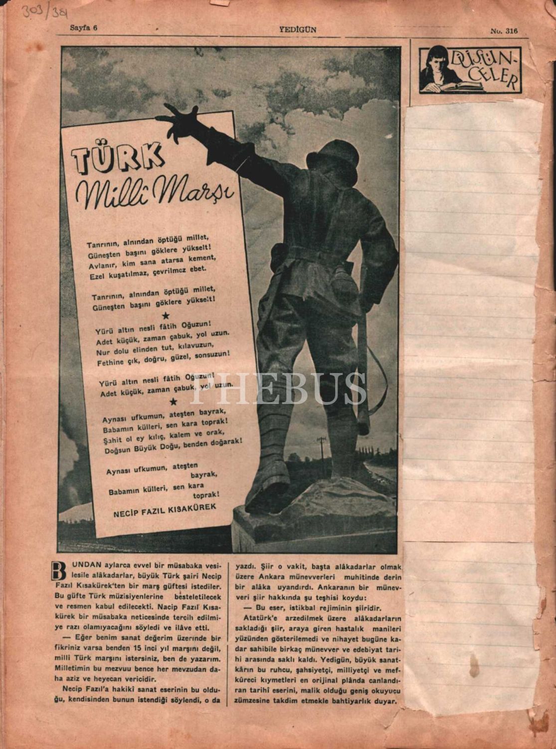 Her şeyden bahseden resimli mecmua YENİGÜN´ün "Türk Milli Marşı" başlıklı yazısının yer aldığı 316. sayısı, 28 Mart 1939, 25x33 cm