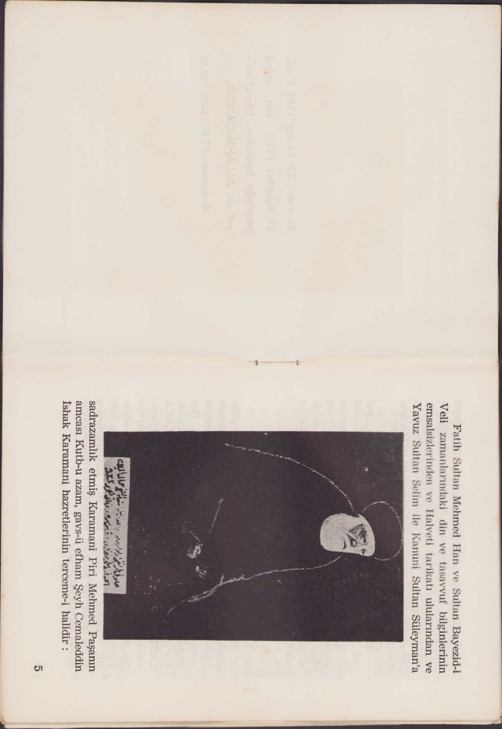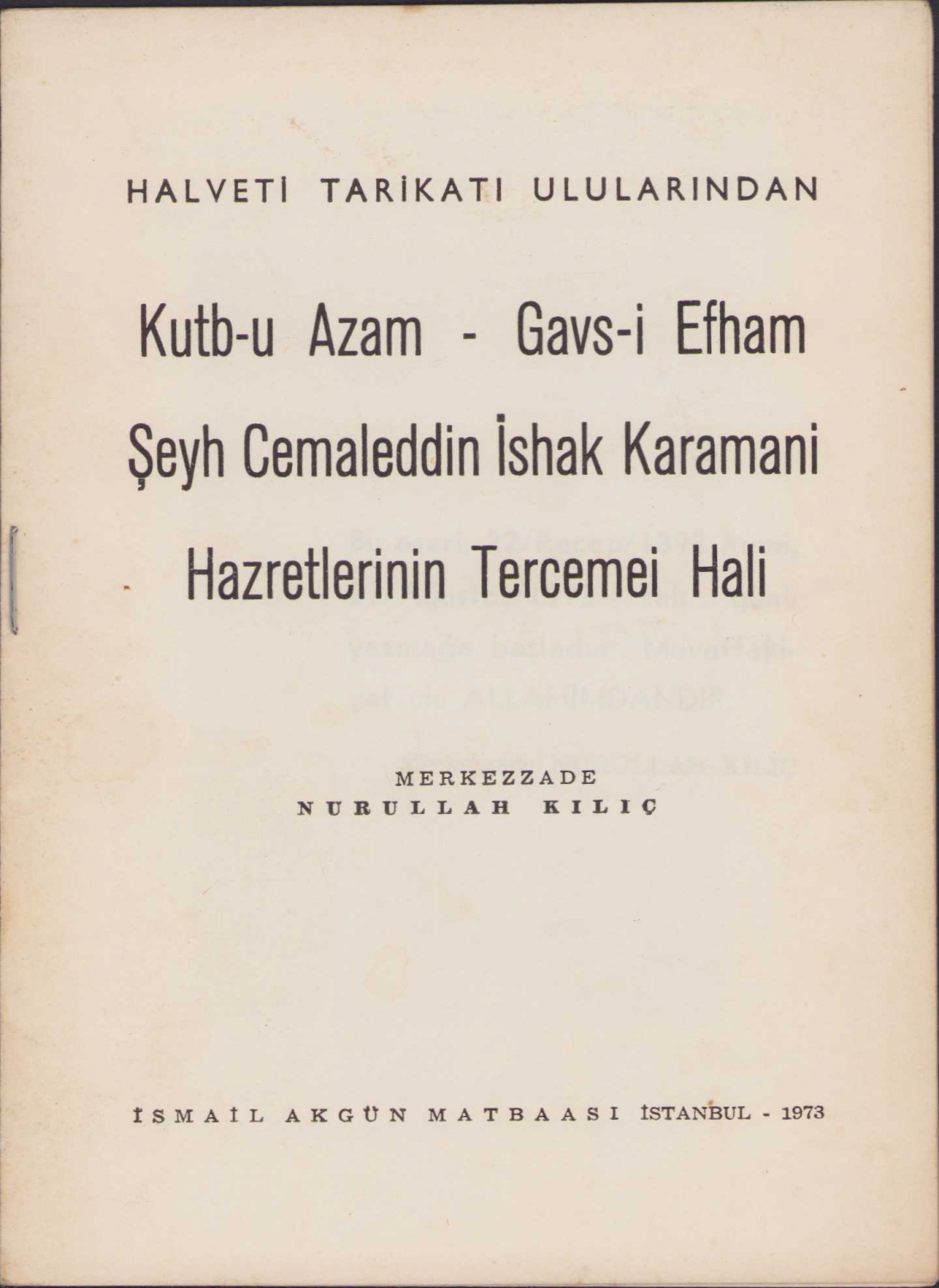 Halveti Tarikatı Şeyh Cemaleddin İshak Karamani Hazretlerinin tercemei hali, 1973, müellif Nurullah Kılıç, İsmail Akgün Matbaası, 15 sayfa