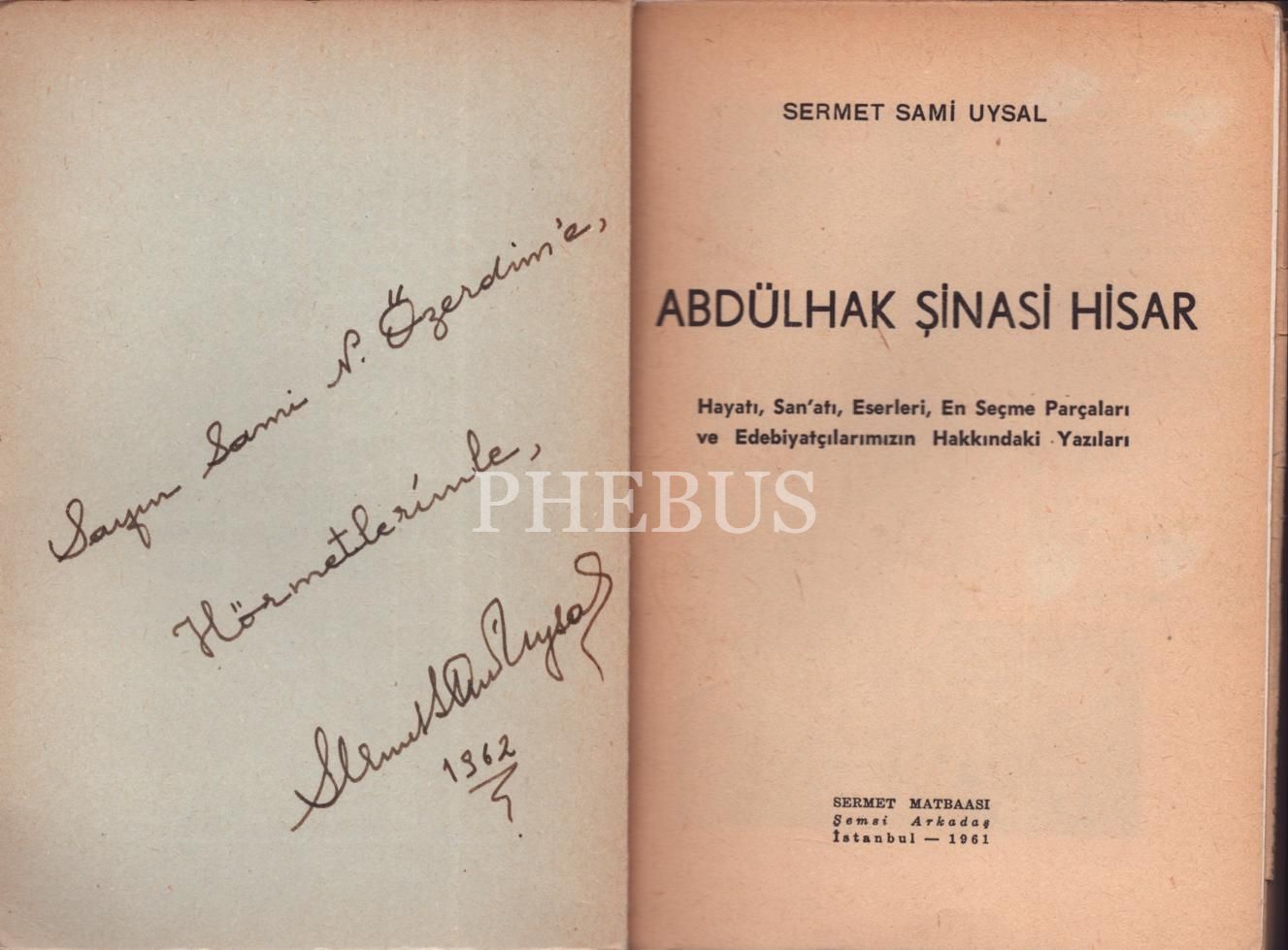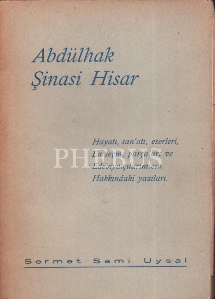 ABDULHAK ŞİNASİ HİSAR (Hayatı, san´atı, eserleri, En seçme parçaları ve Edebiyatçılarımızın Hakkındaki yazıları.), Sermet Sami Uysal, Sermet Matbaası, İstanbul 1961, 271 sayfa, 12x16 cm, İTHAFLI VE İMZALI