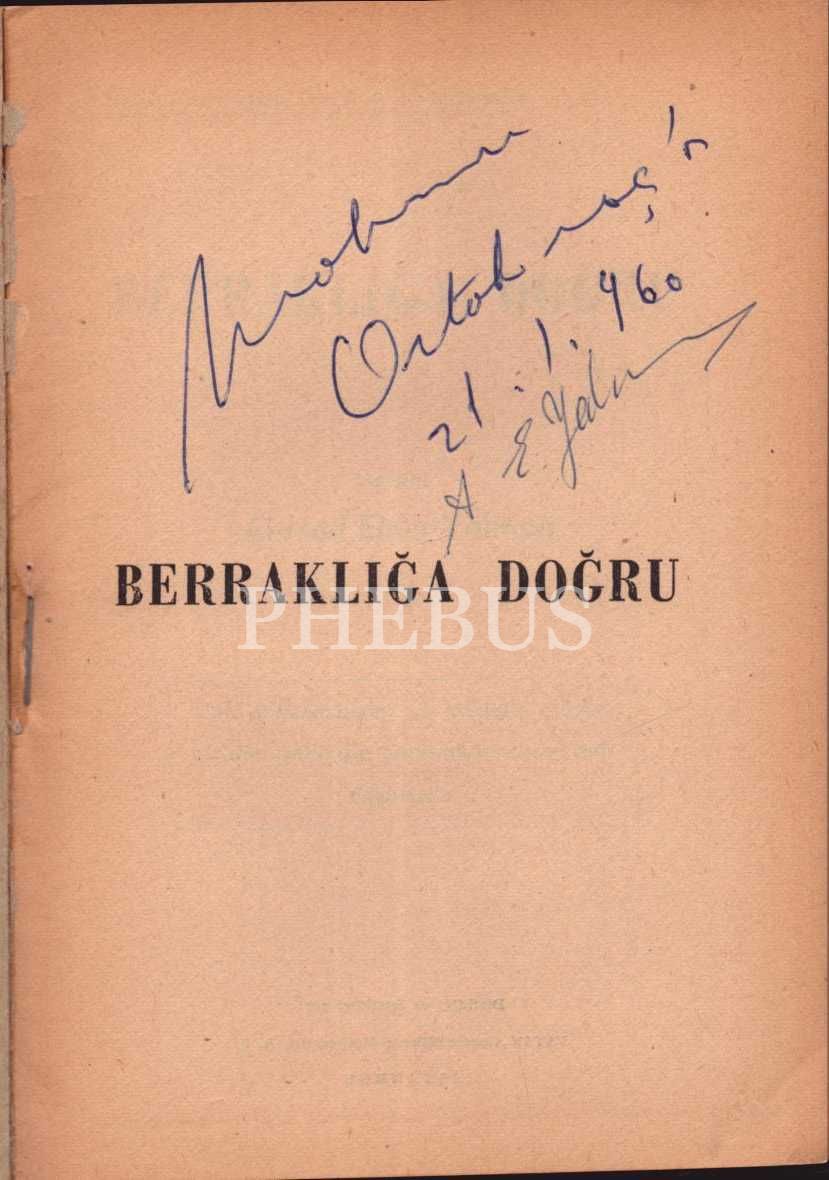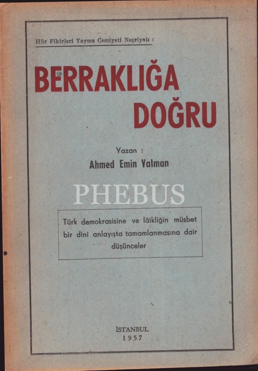Hür Fikirleri Yayma Cemiyeti Neşriyatı: BERRAKLIĞA DOĞRU, Ahmed Emin Yalman, İstanbul - 1957, 71 sayfa, 14x20 cm, İTHAFLI VE İMZALI