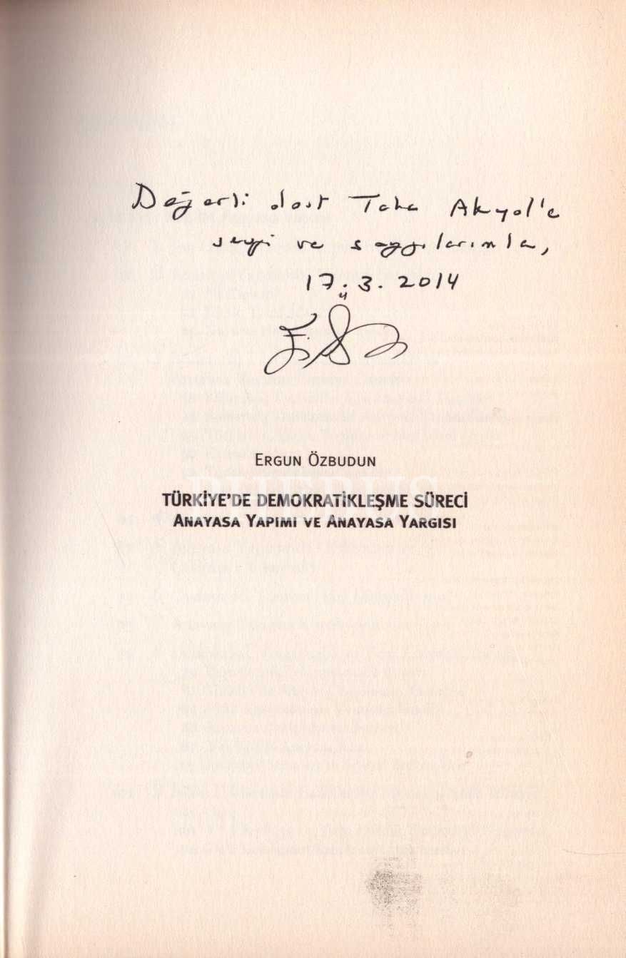 TÜRKİYE´DE DEMOKRATİKLEŞME SÜRECİ (Anayasa Yapımı ve Anayasa Yargısı), Ergun Özbudun, İstanbul Bilgi Üniversitesi Yayınları, Mart 2014, 214 sayfa, 16x23 cm, Taha Akyol'a İTHAFLI VE İMZALI