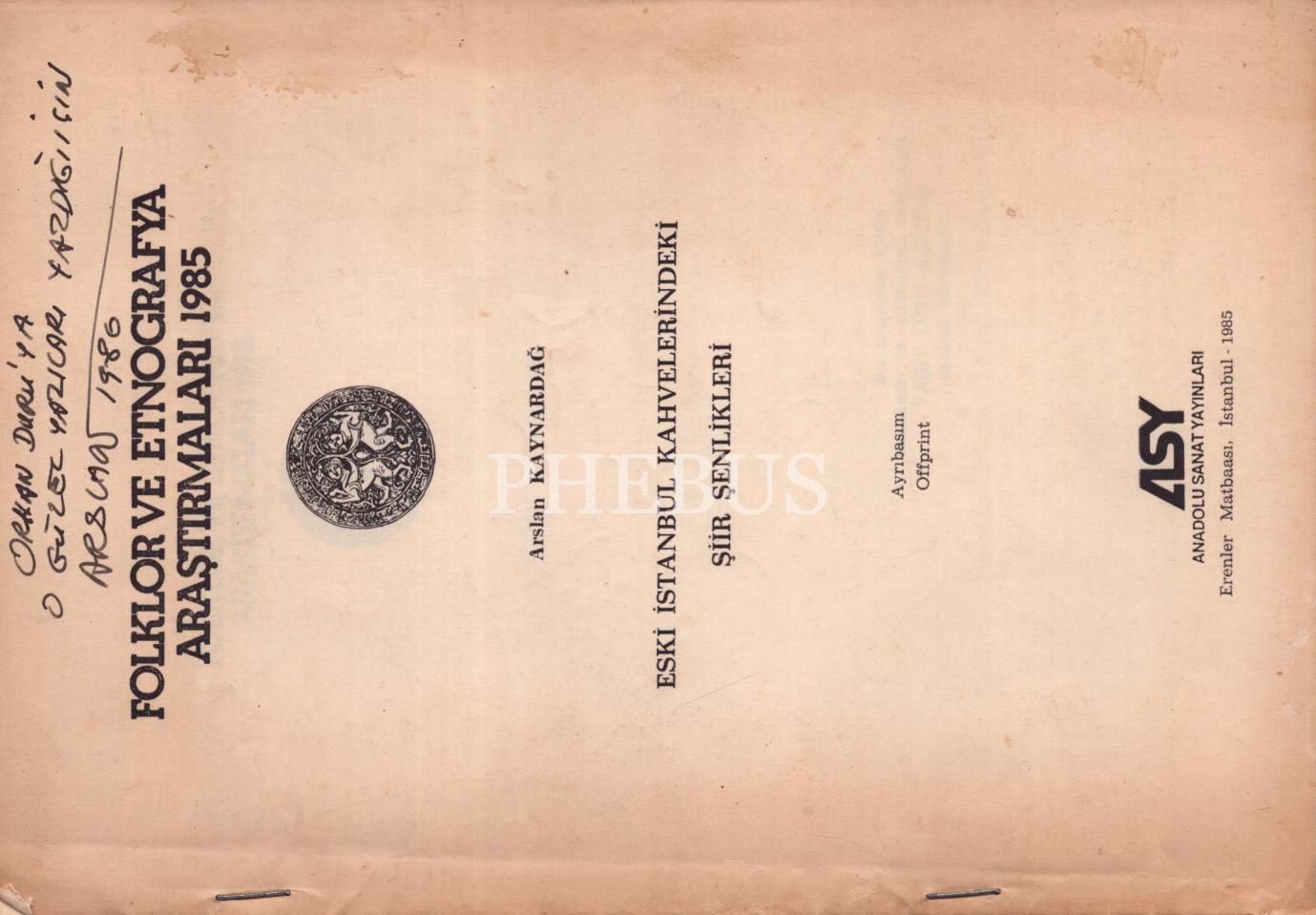 Folklor ve Etnografya Araştırmaları 1985: ESKİ İSTANBUL KAHVELERİNDEKİ ŞİİR ŞENLİKLERİ, Arslan Kaynardağ, Anadolu Sanat Yayınları, İstanbul - 1985, 16 sayfa, 17x24 cm, Orhan Duru'ya İTHAFLI VE İMZALI