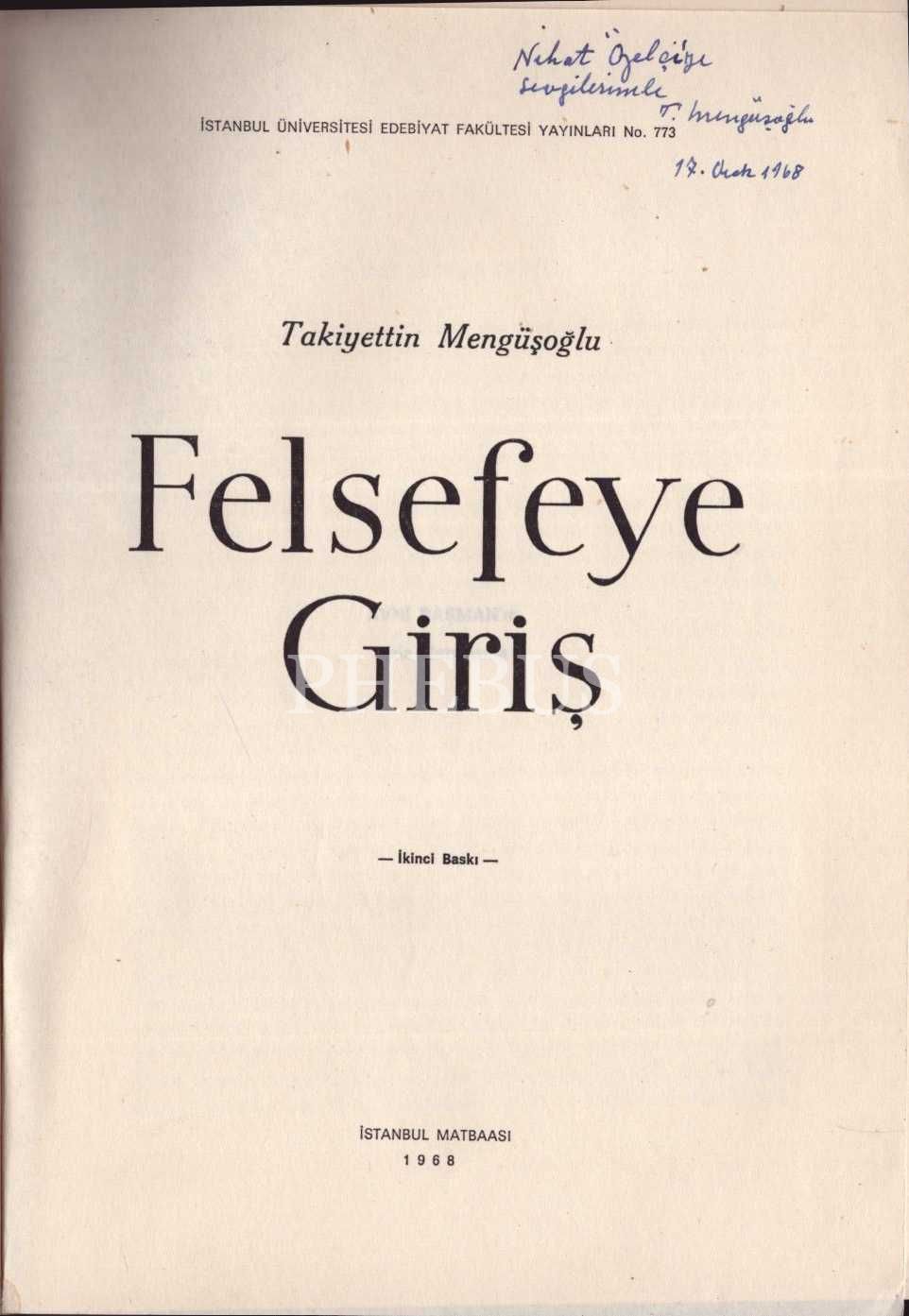 FELSEFEYE GİRİŞ, Takiyettin Mengüşoğlu, İstanbul Matbaası, 1968, 326 sayfa, 17x24 cm, İTHAFLI VE İMZALI