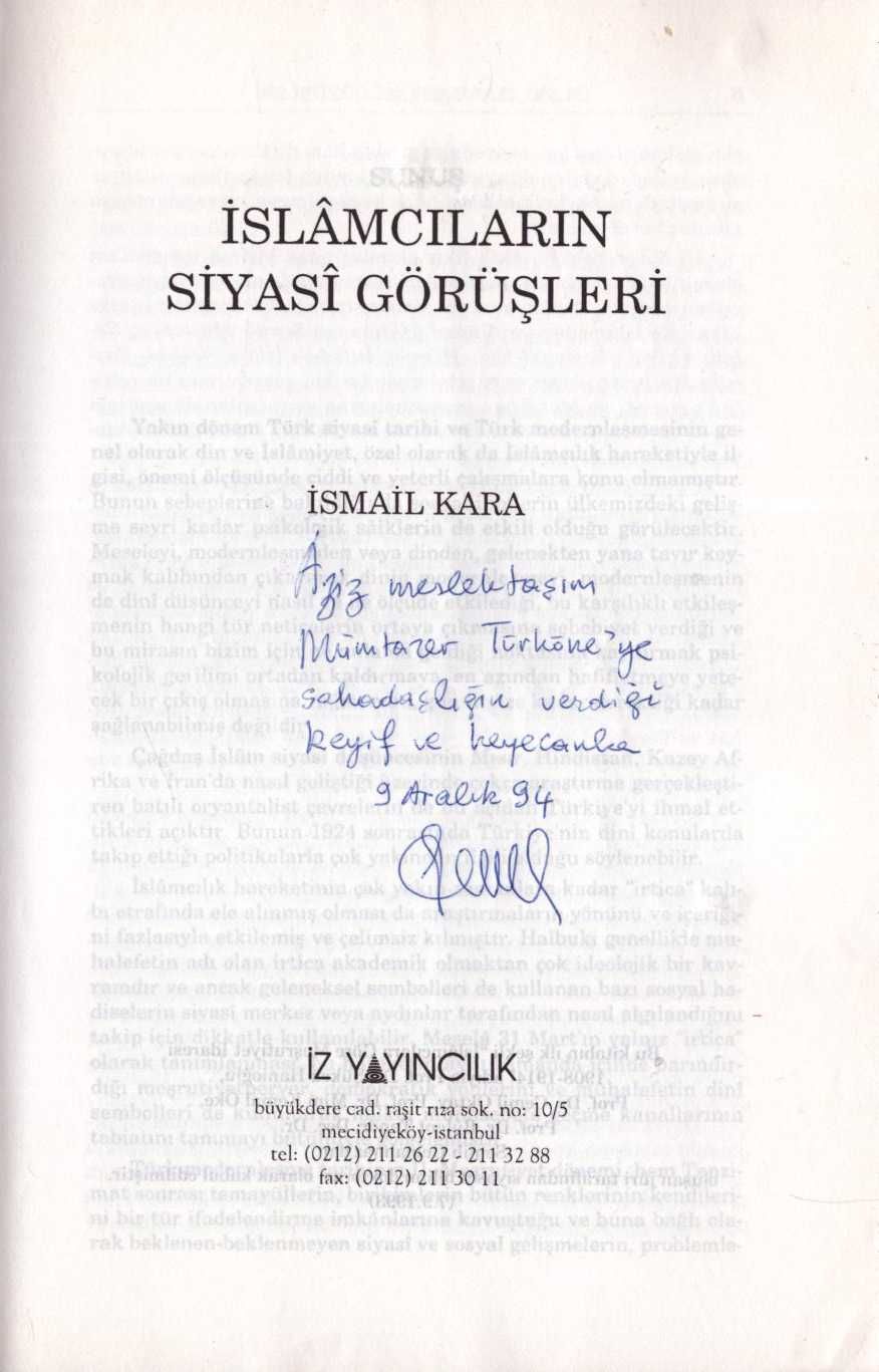 İthaf, "Aziz meslektaşım Mümtazer Türköne´ye sahadaşlığın verdiği keyif ve heyecanla. 9 Aralık 94 İsmail Kara" şeklindedir. Ön ve arka kapağı ortadan kırık, ön kapak içi ve ilk sayfası renkli kalemle karalanmış haliyle.