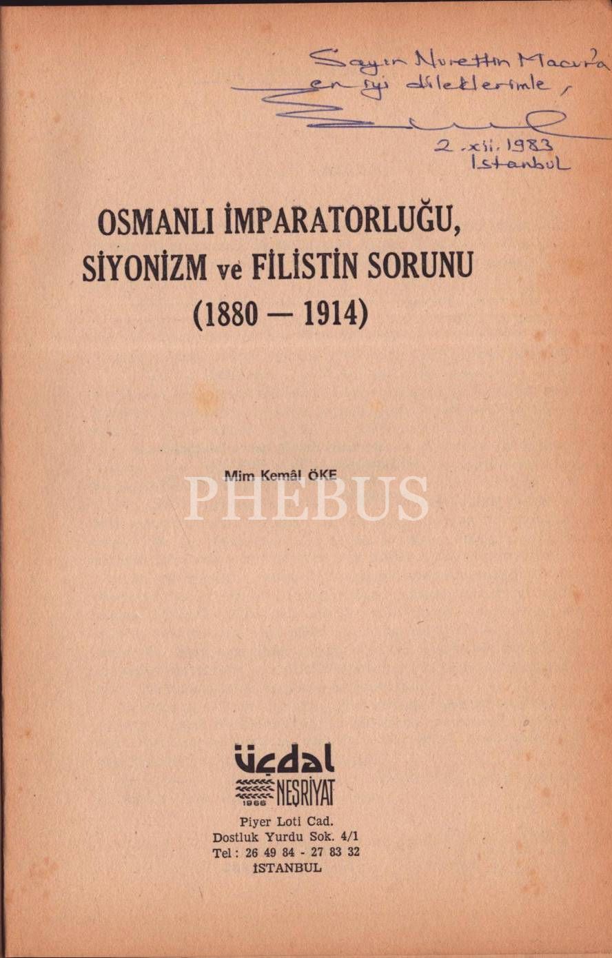 OSMANLI İMPARATORLUĞU, SİYONİZM VE FİLİSTİN SORUNU (1880-1914), Mim Kemâl Öke, Üçdal Neşriyat, İstanbul - 1982, 191 sayfa, 16x24 cm, İTHAFLI VE İMZALI