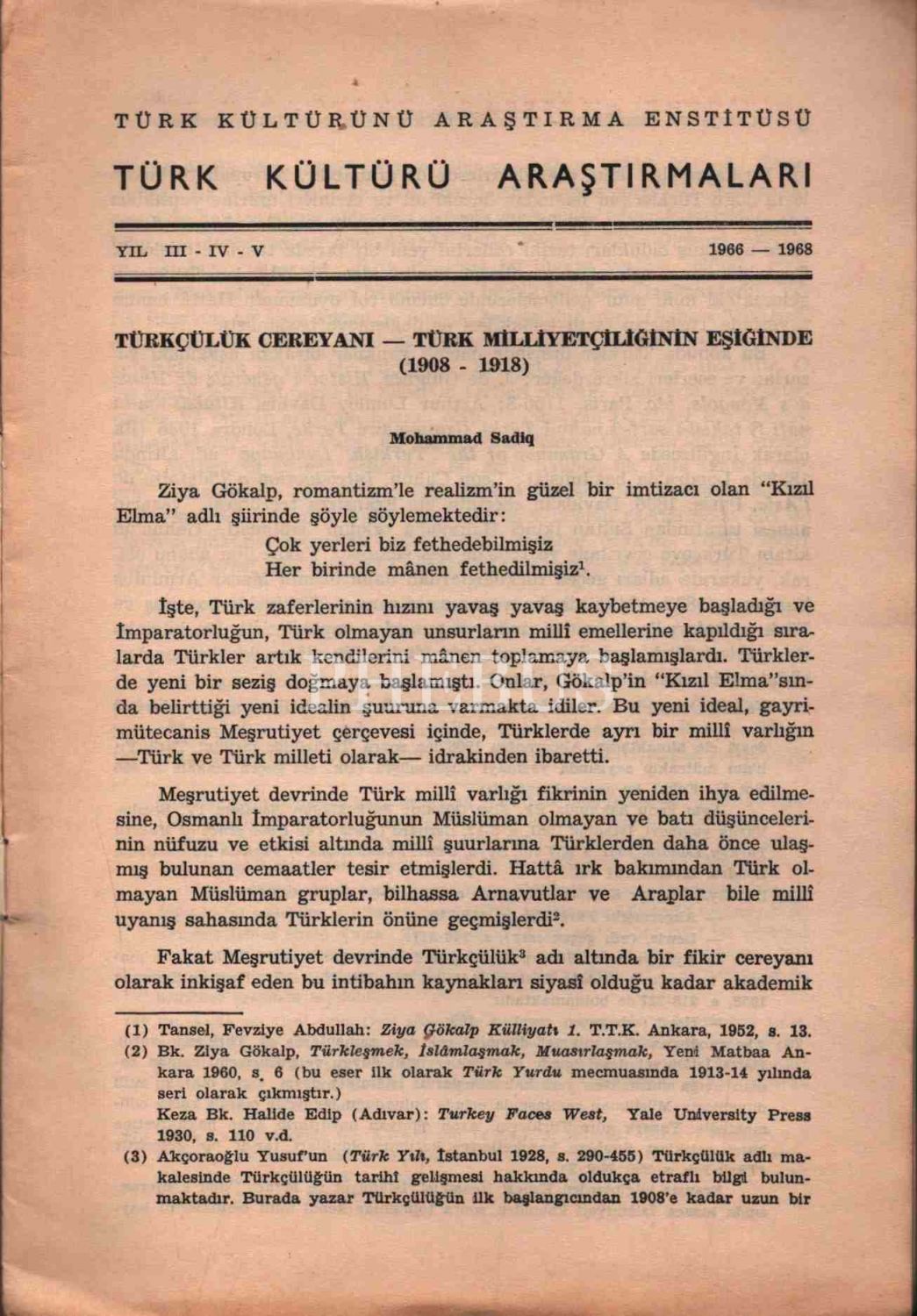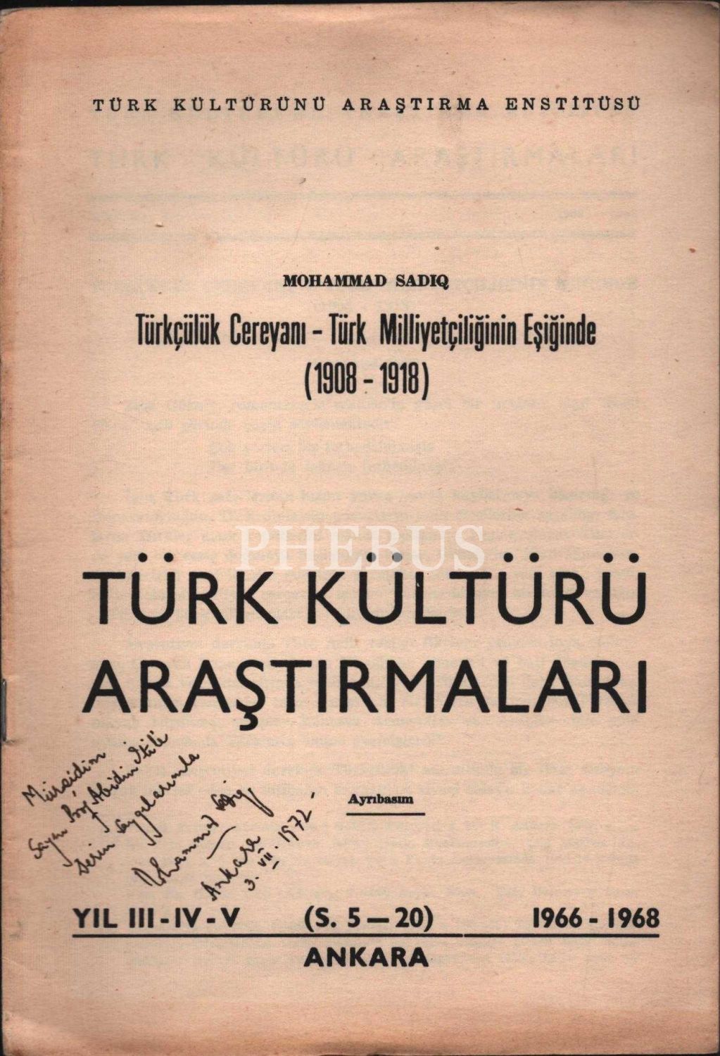 TÜRKÇÜLÜK CEREYANI - TÜRK MİLLİYETÇİLİĞİNİN EŞİĞİNDE (1908-1918), Mohammad Sadıq, Türk Kültürü Araştırmaları, 1966-68, 16 sayfa, 17x25 cm, İTHAFLI VE İMZALI
