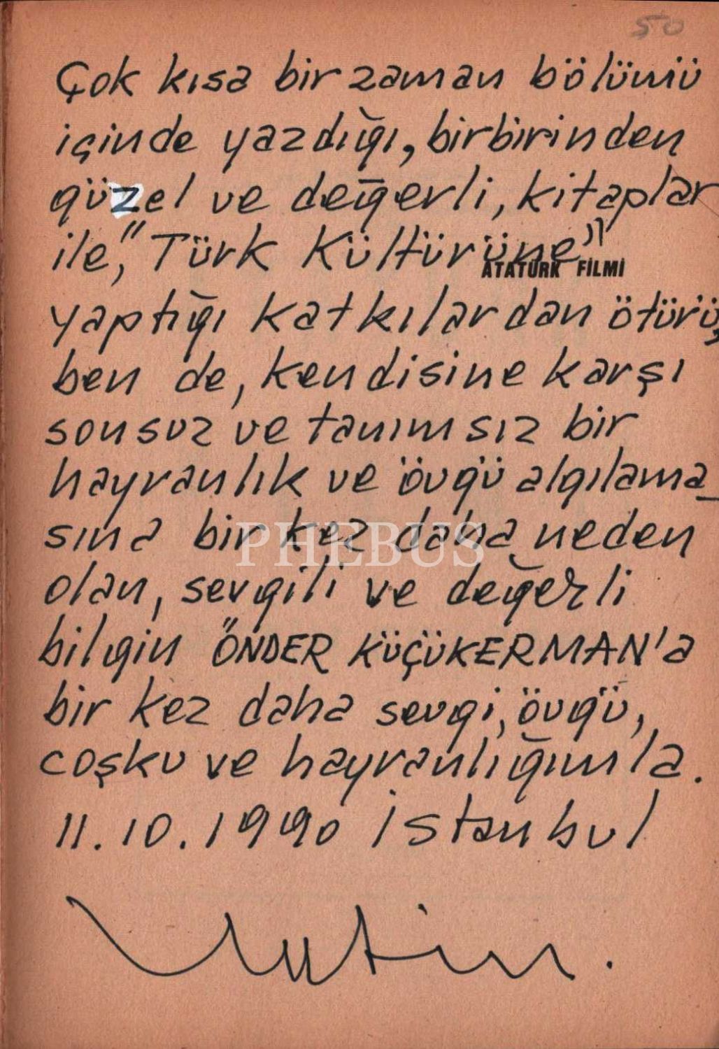 İthaf, "Çok kısa bir zaman bölümü içinde yazdığı, birbirinden güzel ve değerli kitaplar ile ´Türk Kültürüne´ yaptığı katkılardan ötürü ben de, kendisine karşı sonsuz ve tanımsız bir hayranlık ve övgü algılamasına bir kez daha neden olan, sevgili ve değerli bilgin ÖNDER KÜÇÜKERMAN´a bir kez daha sevgi, övgü, coşku ve hayranlığımla. 11.10.1990 İstanbul. Metin." şeklindedir.
