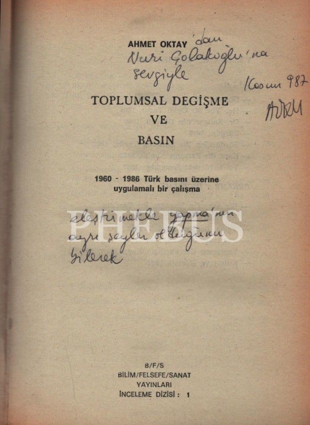 TOPLUMSAL DEĞİŞME VE BASIN (1960-1986 Türk Basını Üzerine Uygulamalı Bir Çalışma), Ahmet Oktay, Bilim/Felsefe/Sanat Yayınları, 1987, 156 sayfa, 14x20 cm, Nuri Çolakoğlu'na İTHAFLI VE İMZALI