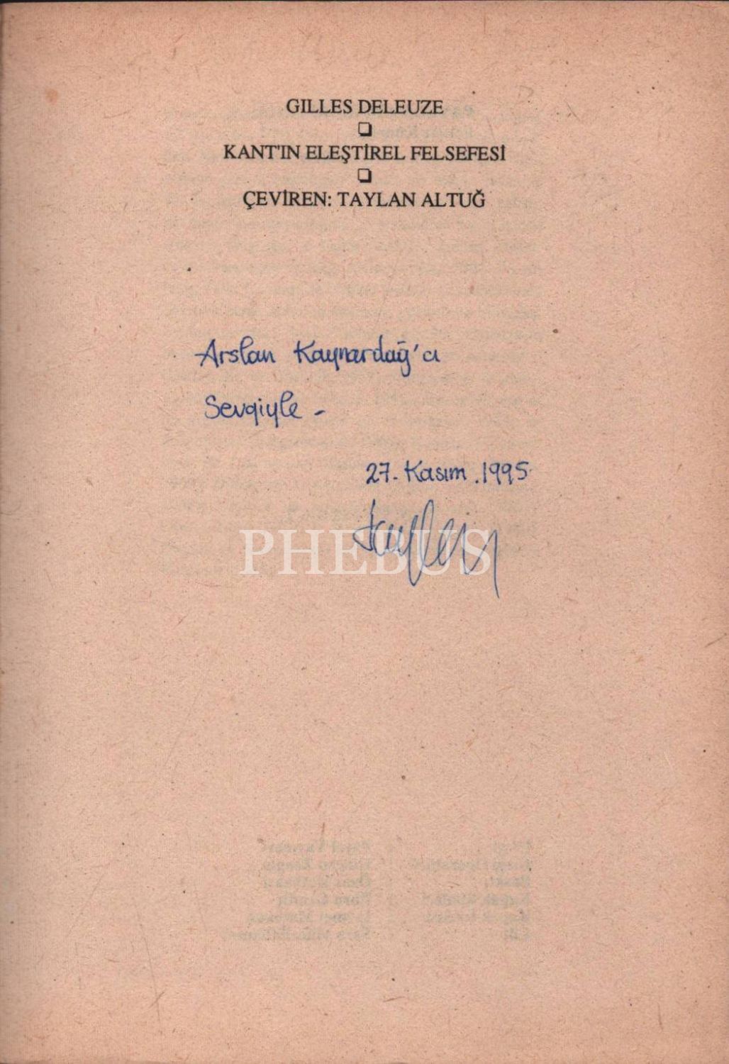 KANT´IN ELEŞTİREL FELSEFESİ (Yetiler Öğretisi), Gilles Deleuze, çeviren: Taylan Altuğ, Payel Yayınları, 1995, 123 sayfa, 14x20 cm, Arslan Kaynardağ'a İTHAFLI VE İMZALI