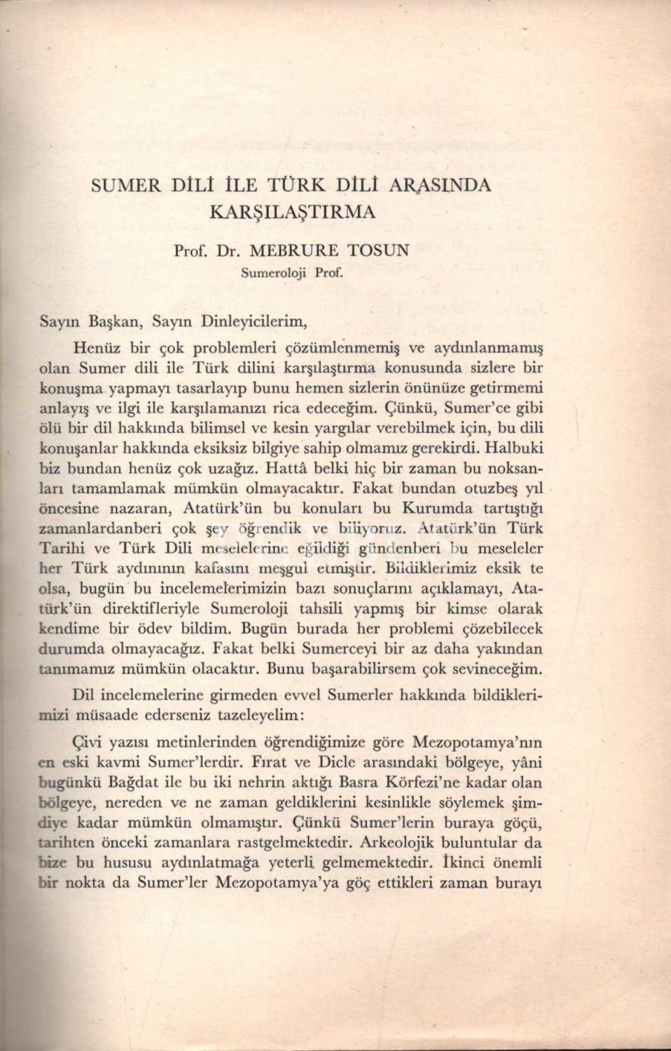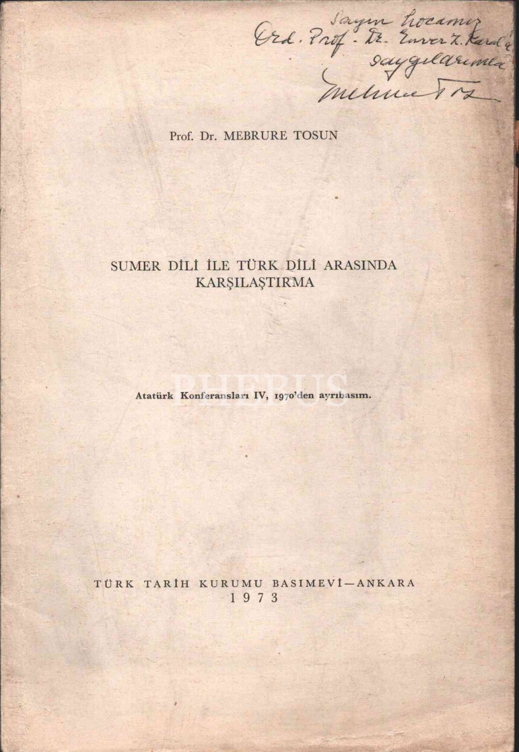 SUMER DİLİ İLE TÜRK DİLİ ARASINDA KARŞILAŞTIRMA, Mebrure Tosun, Türk Tarih Kurumu Basımevi, Ankara - 1973, 22 sayfa, 16x24 cm, Ord. Prof. Dr. Enver Ziya Koral'a İTHAFLI VE İMZALI