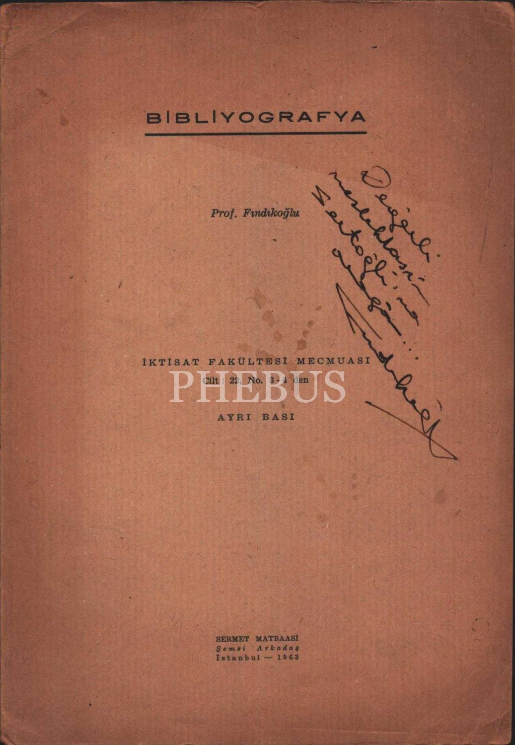 BİBLİYOGRAFYA, Prof. Ziyaeddin Fahri Fındıkoğlu, Sermet Matbaası, İstanbul - 1963, 6 sayfa, 17x24 cm, İTHAFLI VE İMZALI
