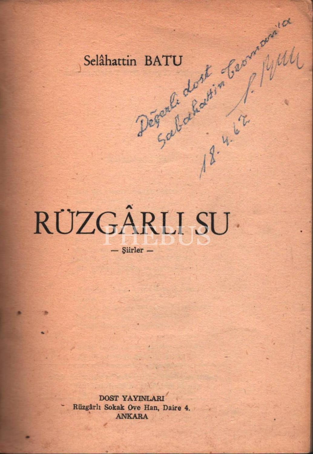 RÜZGÂRLI SU (Şiirler), Selâhattin Batu, Dost Yayınları, Ankara - Nisan 1962, 54 sayfa, 14x20 cm, Sabahattin Teoman'a İTHAFLI VE İMZALI