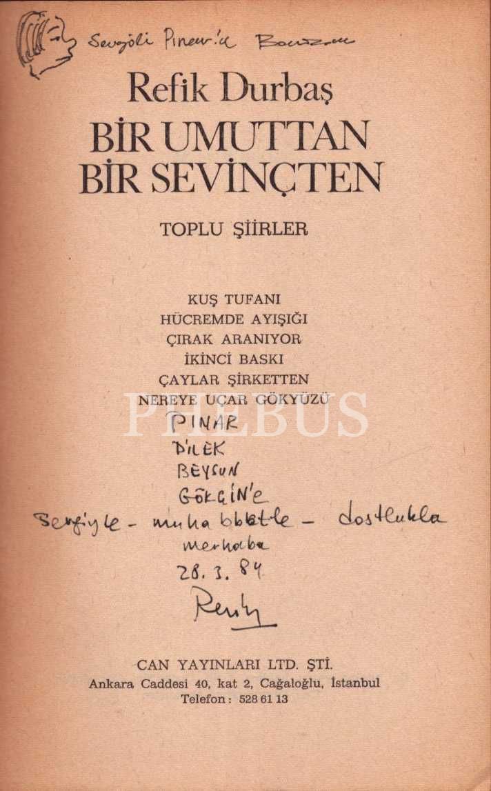 BİR UMUTTAN BİR SEVİNÇTEN (Toplu Şiirler), Can Yayınları, İstanbul - 1984, 298 sayfa, 13x20 cm, İTHAFLI VE İMZALI