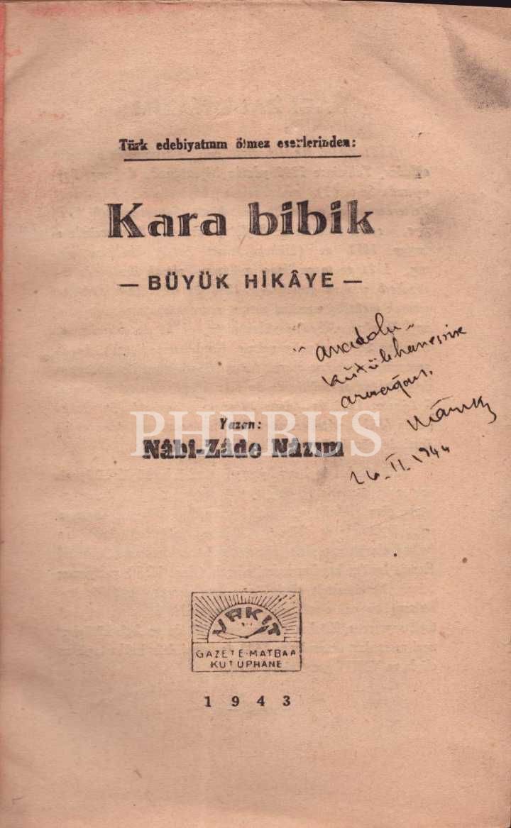 Türk Edebiyatının Ölmez Eserlerinden: KARA BİBİK (Büyük Hikâye), Nâbî-Zâde Nâzım, hazırlayan: Hakkı Tarık Us, Vakit Gazete-Matbaa-Kütüphane, 1943, 39 sayfa, İTHAFLI VE İMZALI