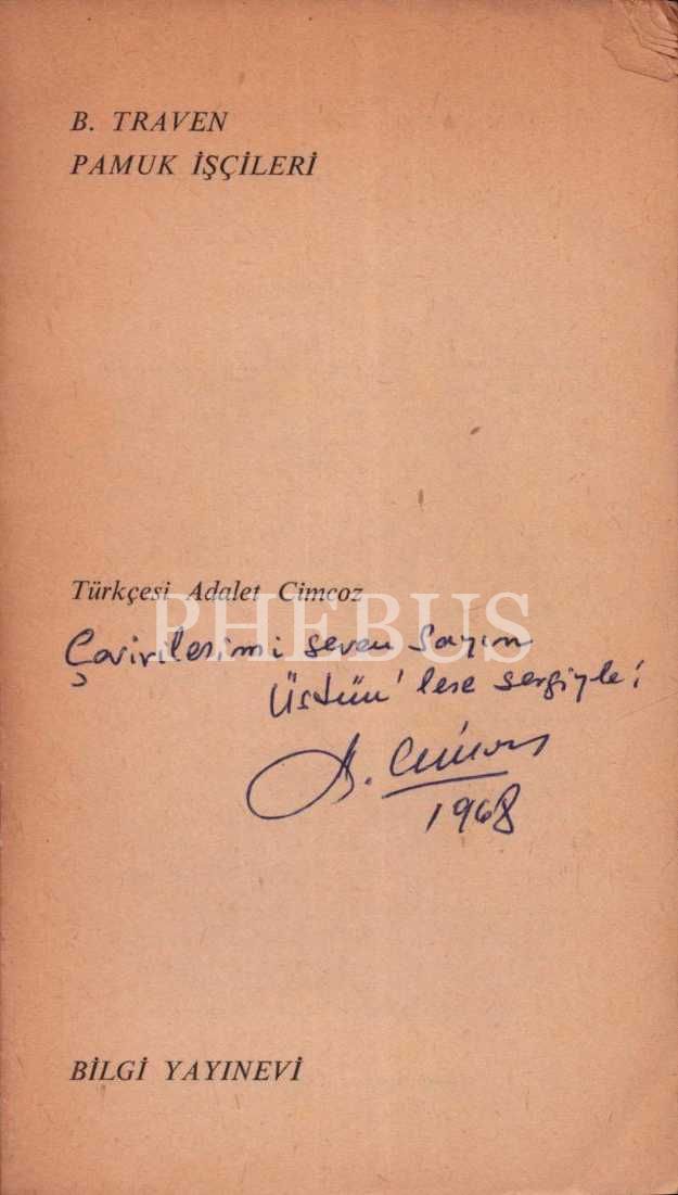 PAMUK İŞÇİLERİ, B. Traven, Türkçesi: Adalet Cimcoz, Bilgi Yayınevi, Haziran 1968, 212 sayfa, 11x19 cm, çevirmeninden İTHAFLI VE İMZALI