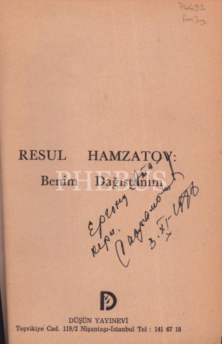 BENİM DAĞISTANIM, Resul Hamzatov, çeviren: Mazlum Beyhan, Düşün Yayınevi, İstanbul - 1984, 480 sayfa, 14x20 cm, yazarından İTHAFLI VE İMZALI