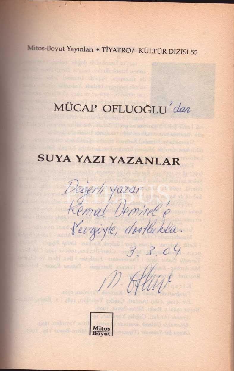 SUYA YAZI YAZANLAR, Mücap Ofluoğlu, Mitos-Boyut Yayınları, Kasım 2003, 352 sayfa metin + 16 sayfa görsel, 14x22 cm, Kemal Demirel'e İTHAFLI VE İMZALI