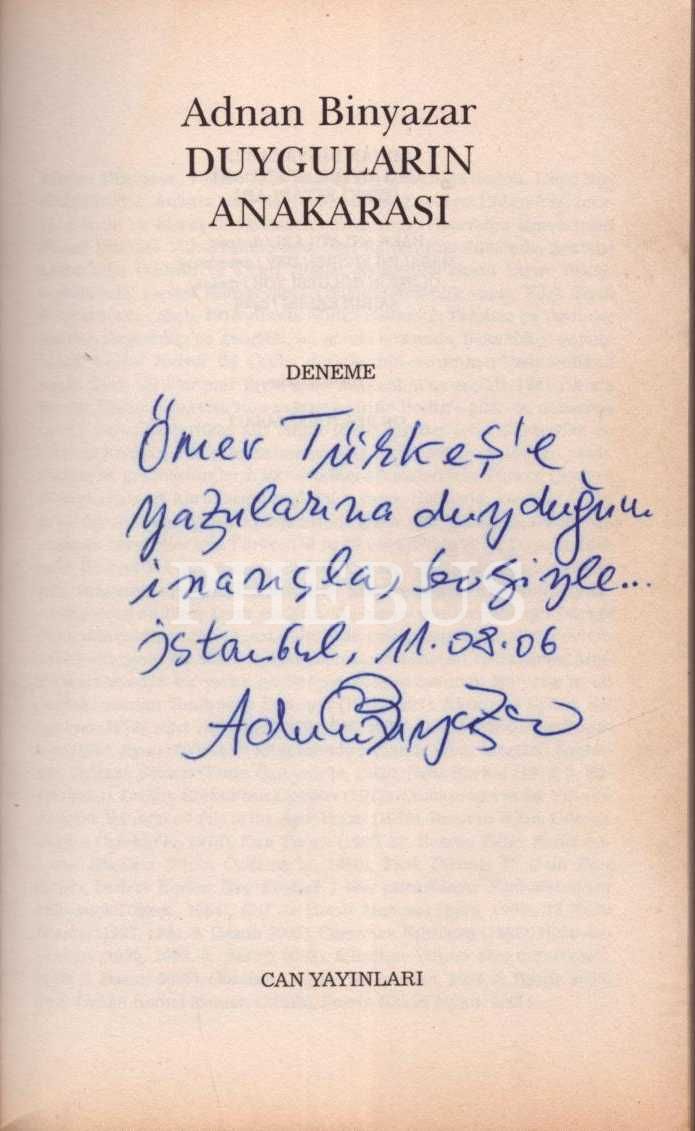 DUYGULARIN ANAKARASI (Deneme), Adnan Binyazar, Can Yayınları, Ağustos 2006, 228 sayfa, 13x20 cm, Ömer Türkeş'e İTHAFLI VE İMZALI
