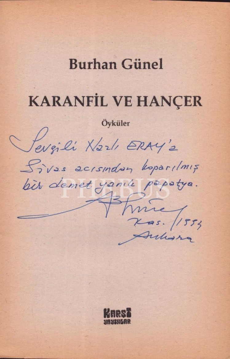 KARANFİL VE HANÇER (Öyküler), Karşı Yayınlar, 1994, 112 sayfa, 13x20 cm, Nazlı Eray'a İTHAFLI VE İMZALI