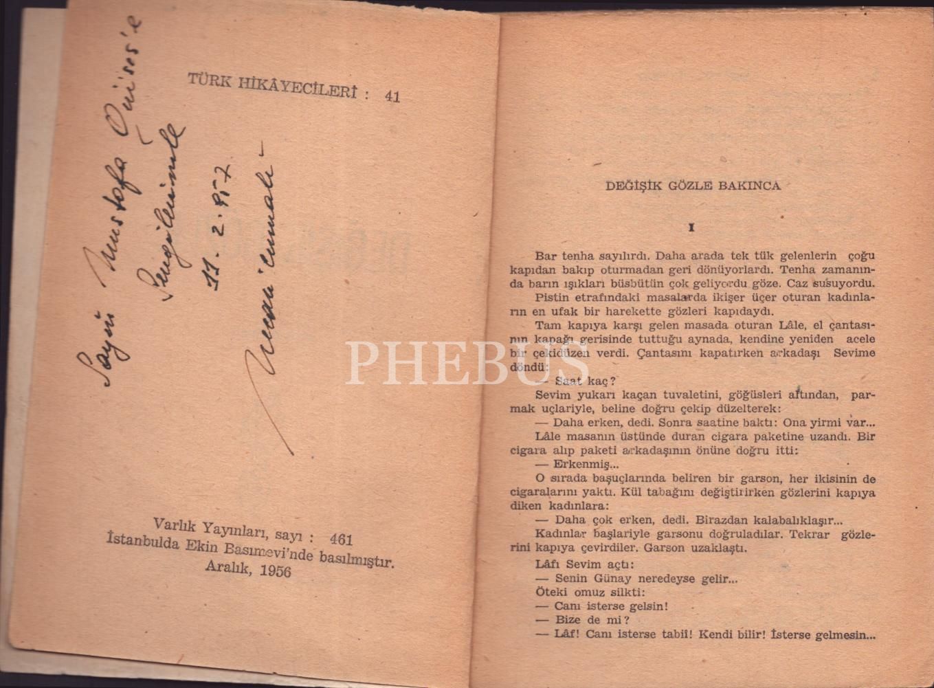DEĞİŞİK GÖZLE (Hikâyeler), Necati Cumalı, Varlık Yayınları, İstanbul - Aralık 1956, 77 sayfa, 12x17 cm, İTHAFLI VE İMZALI