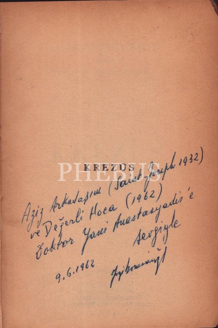 KREZÜS (Dram 3 Perde), Aleksandros Maças, çeviren: Yorgi Horasanoğlu, Yeditepe Yayınları, İstanbul - Mayıs 1962, 85 sayfa, 14x20 cm, çevirmeninden İTHAFLI VE İMZALI