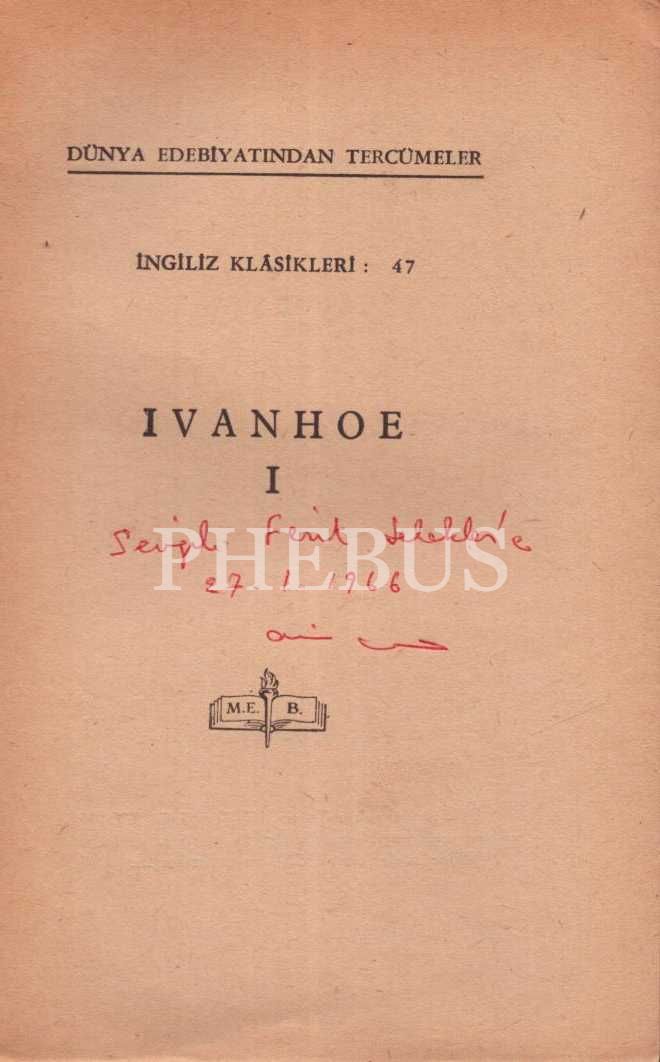 IVANHOE I, Walter Scott, çeviren: Avni Givda, Millî Eğitim Basımevi, İstanbul - 1965, 418 sayfa, 12x18 cm, çevirmeninden İTHAFLI VE İMZALI