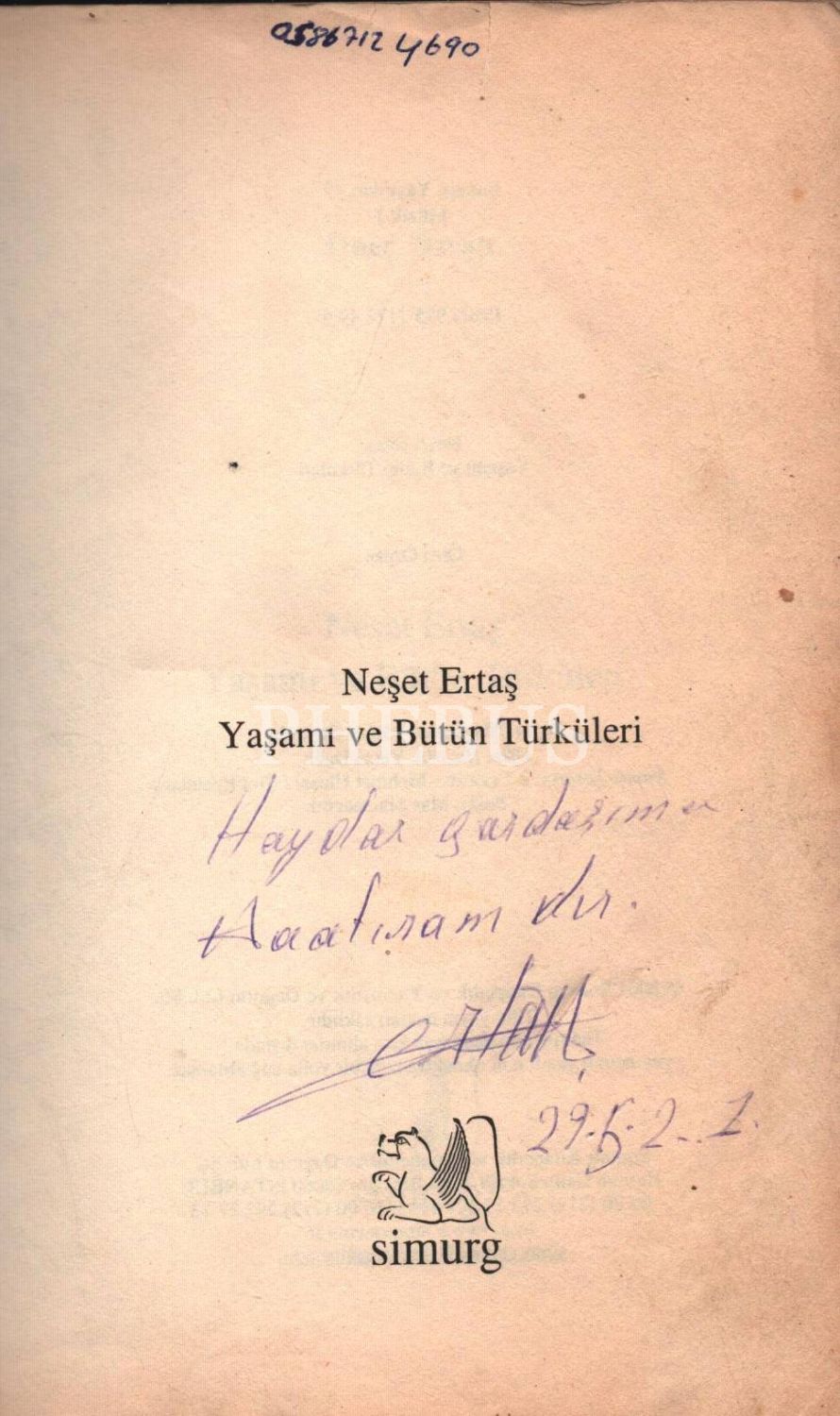 NEŞET ERTAŞ (Yaşamı ve Bütün Türküleri), Öner Özcan, Simurg Yayınları, İstanbul - 2001, 334 sayfa metin + görseller, 14x21 cm, Neşet Ertaş'tan İTHAFLI VE İMZALI