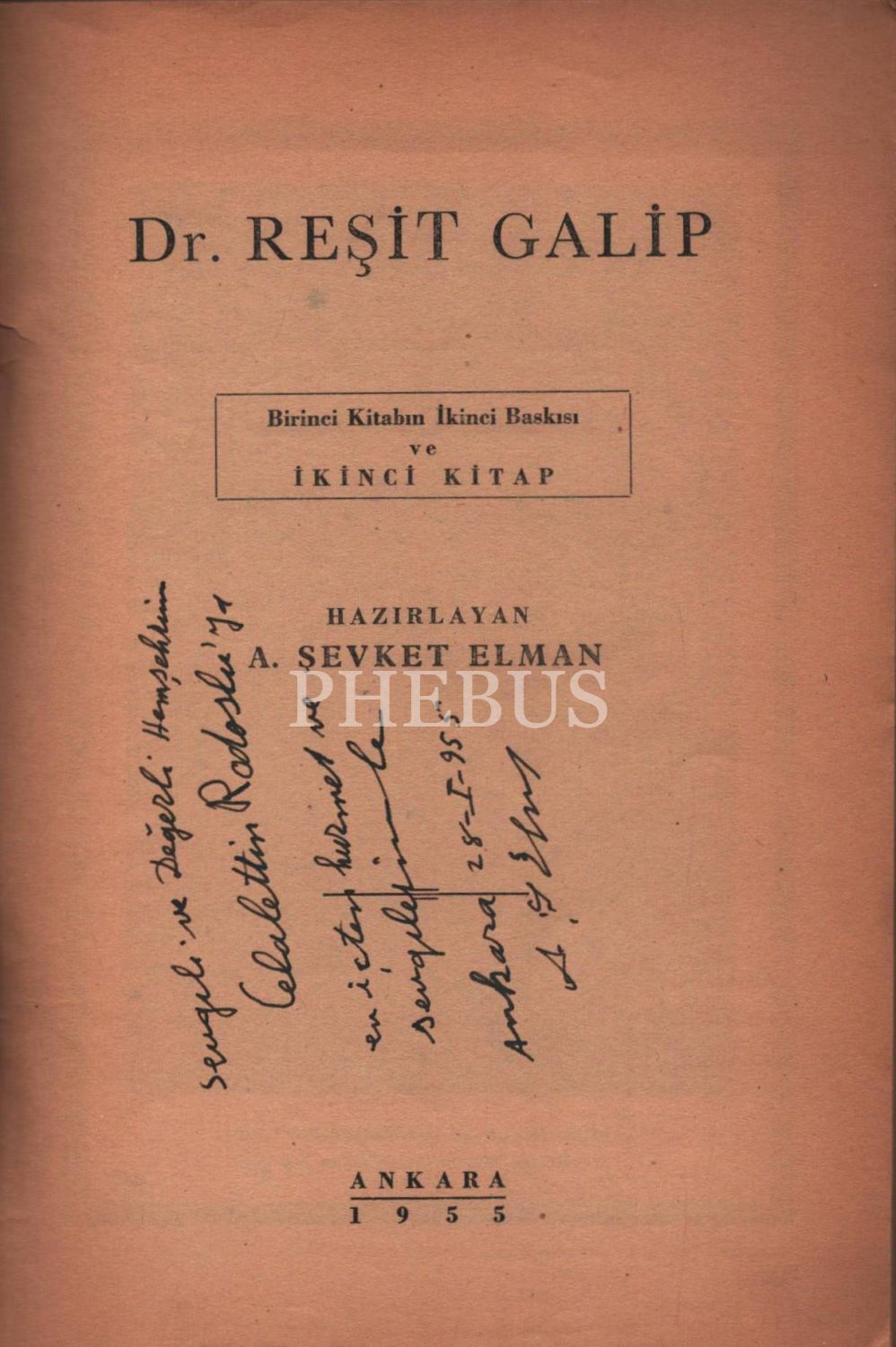DR. REŞİT GALİP (Birinci Kitabın İkinci Baskısı ve İkinci Kitap), hazırlayan: A. Şevket Elman, Yeni Matbaa, Ankara - 1955, 438 sayfa, 17x24 cm, İTHAFLI VE İMZALI