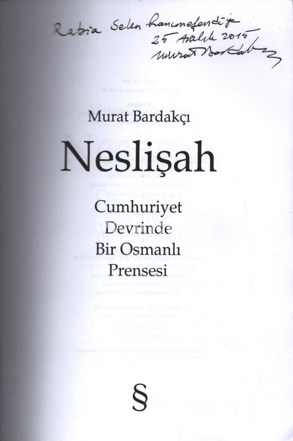 NESLİŞAH (Cumhuriyet Devrinde Bir Osmanlı Prensesi), Murat Bardakçı, Everest Yayınları, Ekim 2011, 420 sayfa, 17x24 cm, İTHAFLI VE İMZALI