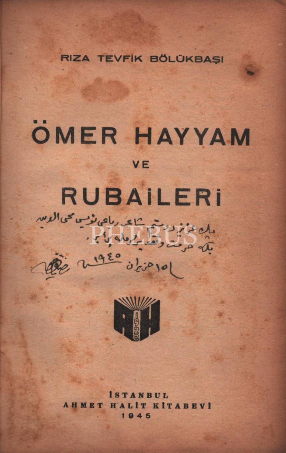 ÖMER HAYYAM VE RUBAİLERİ, Rıza Tevfik Bölükbaşı, Ahmet Halit Kitabevi, İstanbul - 1945, 283 sayfa, 14x21 cm, İTHAFLI VE İMZALI