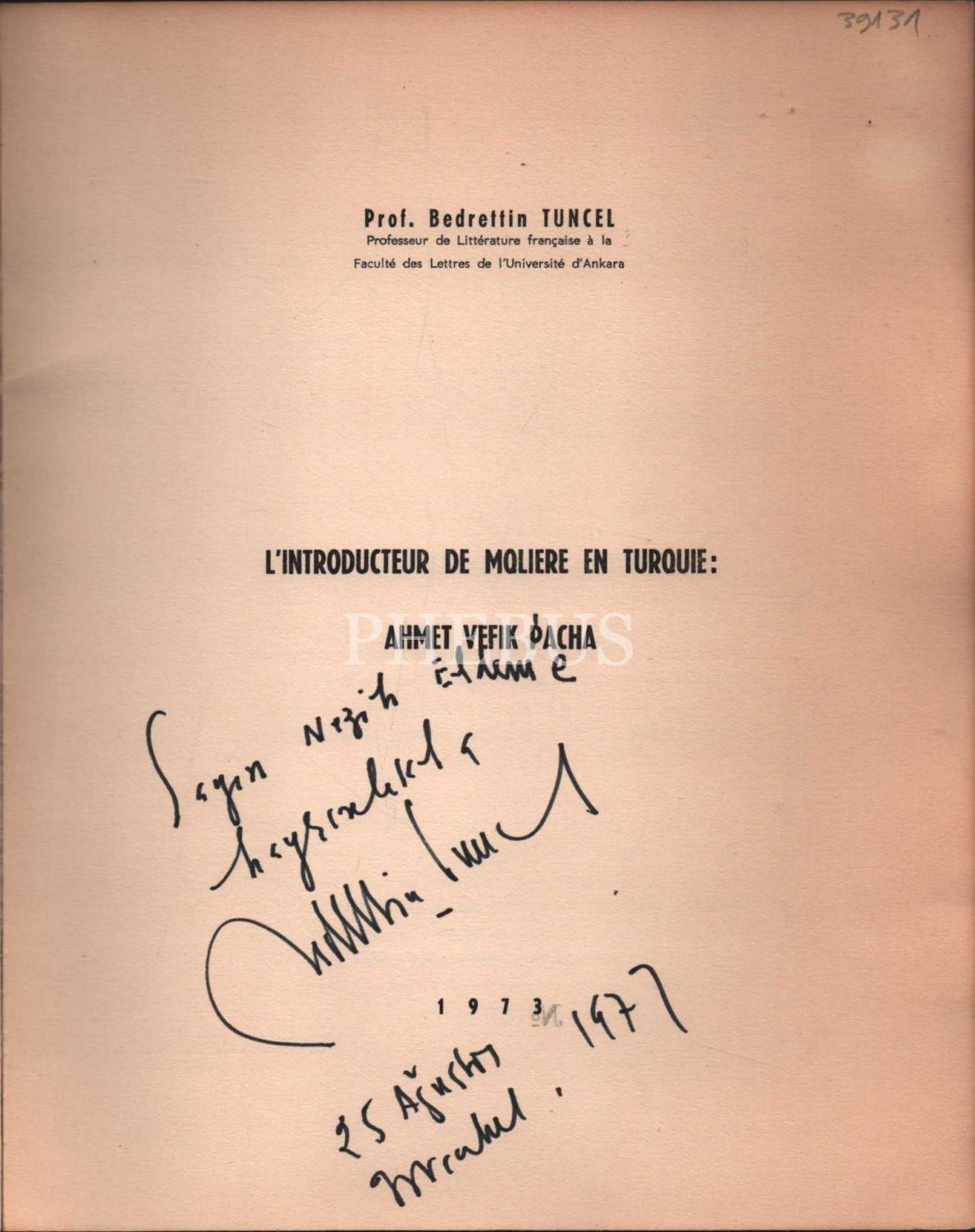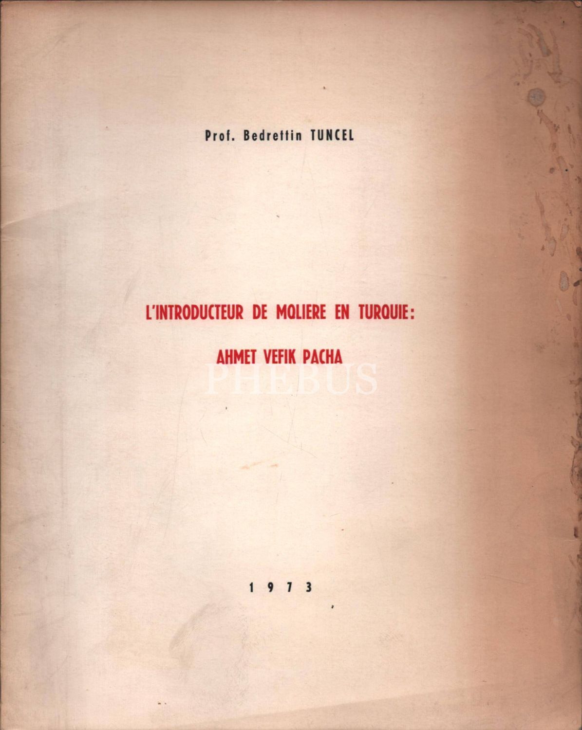 L´INTRODUCTEUR DE MOLIERE EN TURQUIE: AHMET VEFIK PACHA, Bedrettin Tuncel, Imprimerie Başnur, Ankara - Fevrier 1973, 20 sayfa, 20x25 cm, İTHAFLI VE İMZALI