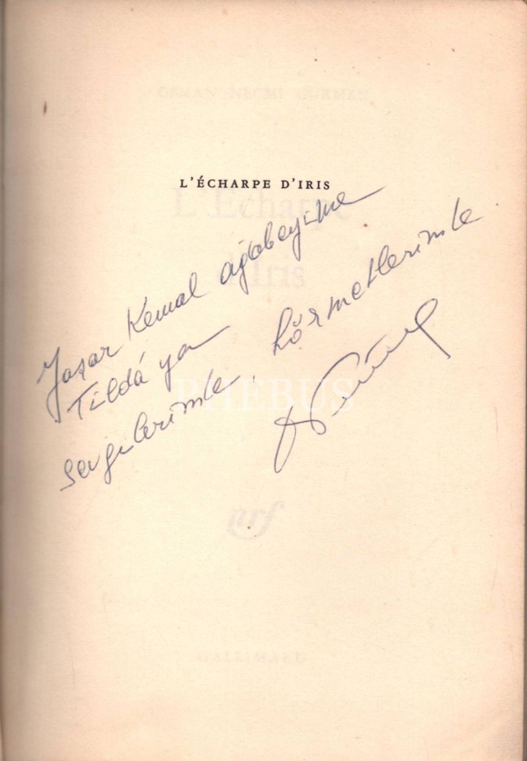 L´ECHARPE D´IRIS (Roman), Osman Necmi Gürmen, Gallimard, 1976, 197 sayfa, 14x21 cm, Yaşar Kemal ve eşi Tilda hanıma İTHAFLI VE İMZALI