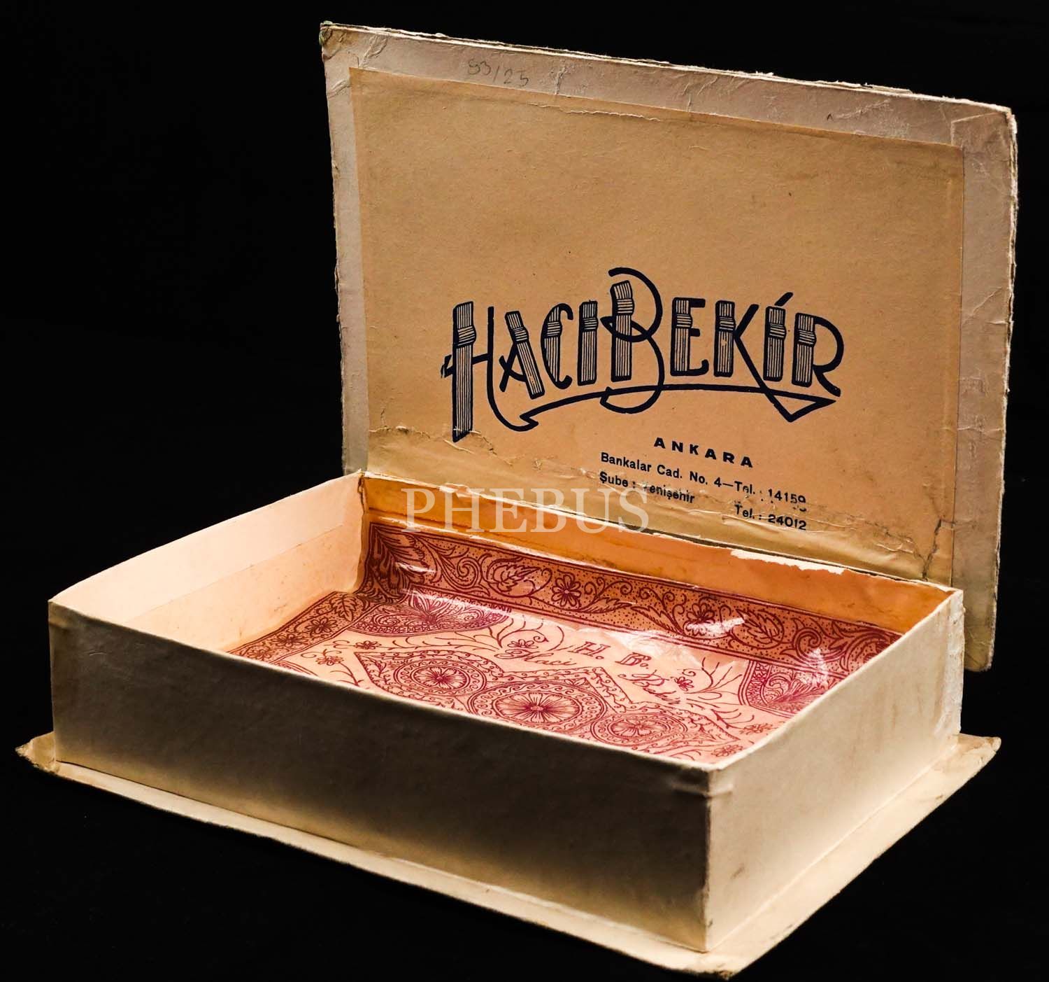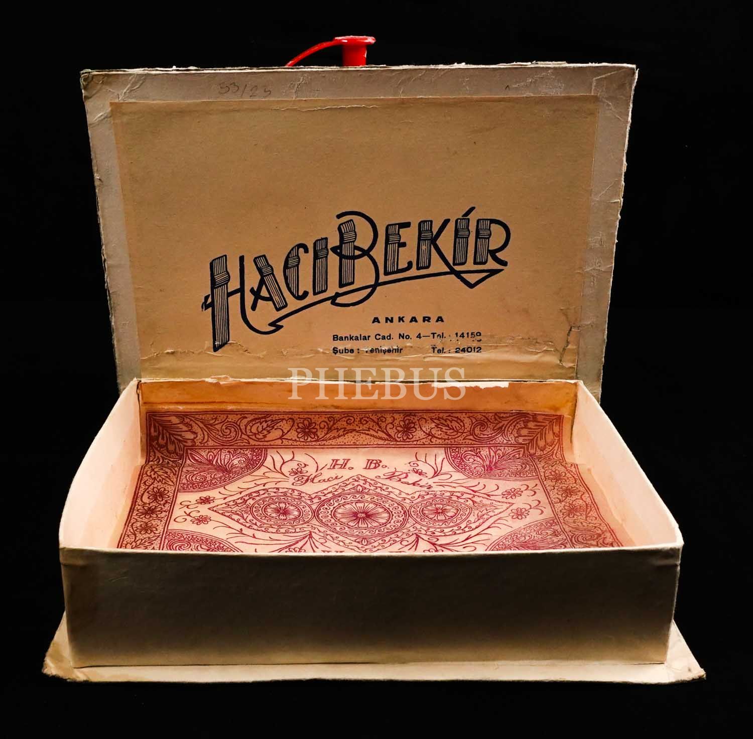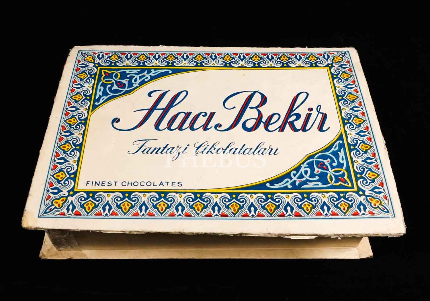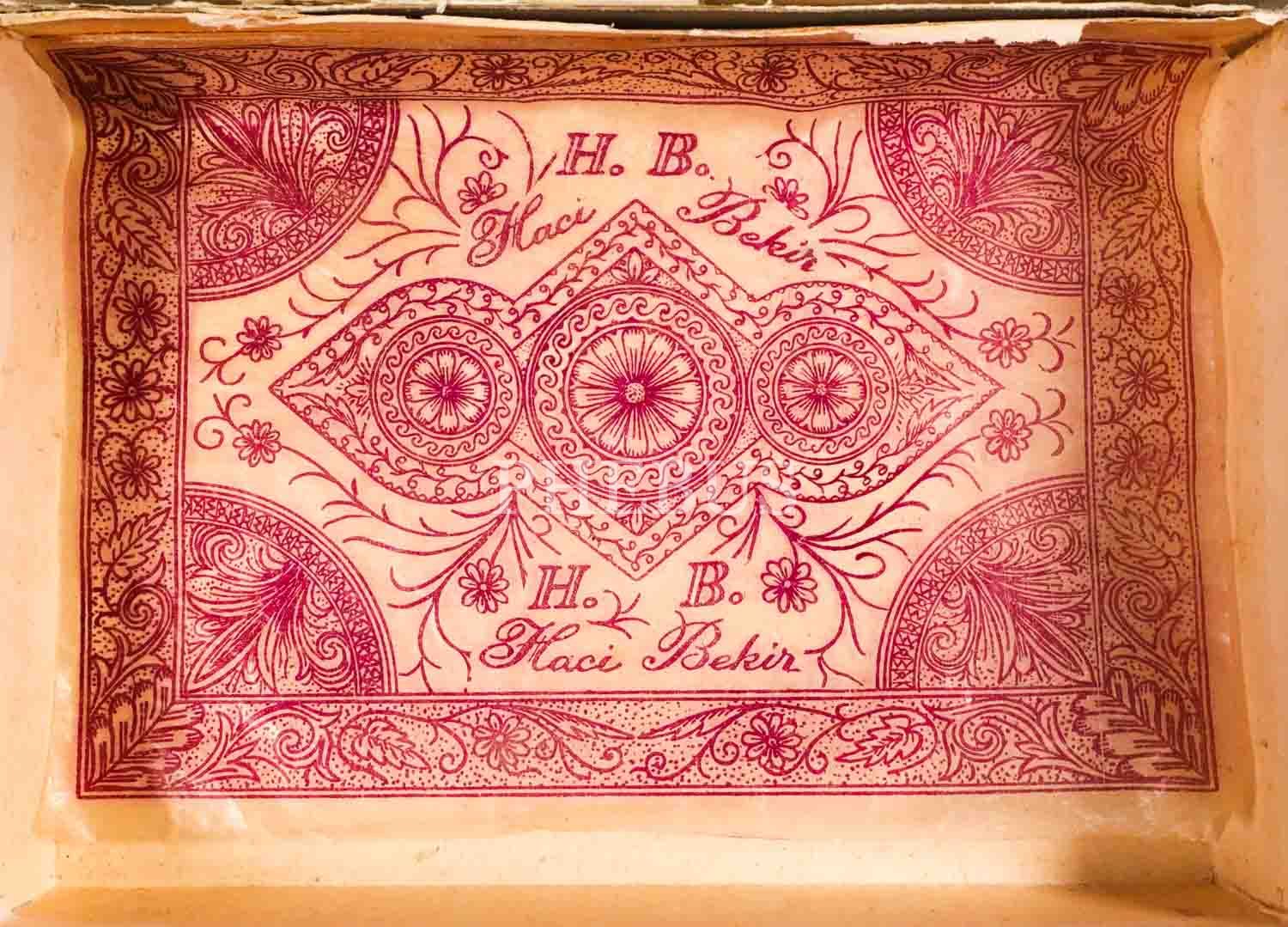 Kapak üzeri ve içi "HACI BEKİR Fantazi Çikolataları" ibareli karton şekerleme kutusu, 22x16x5 cm