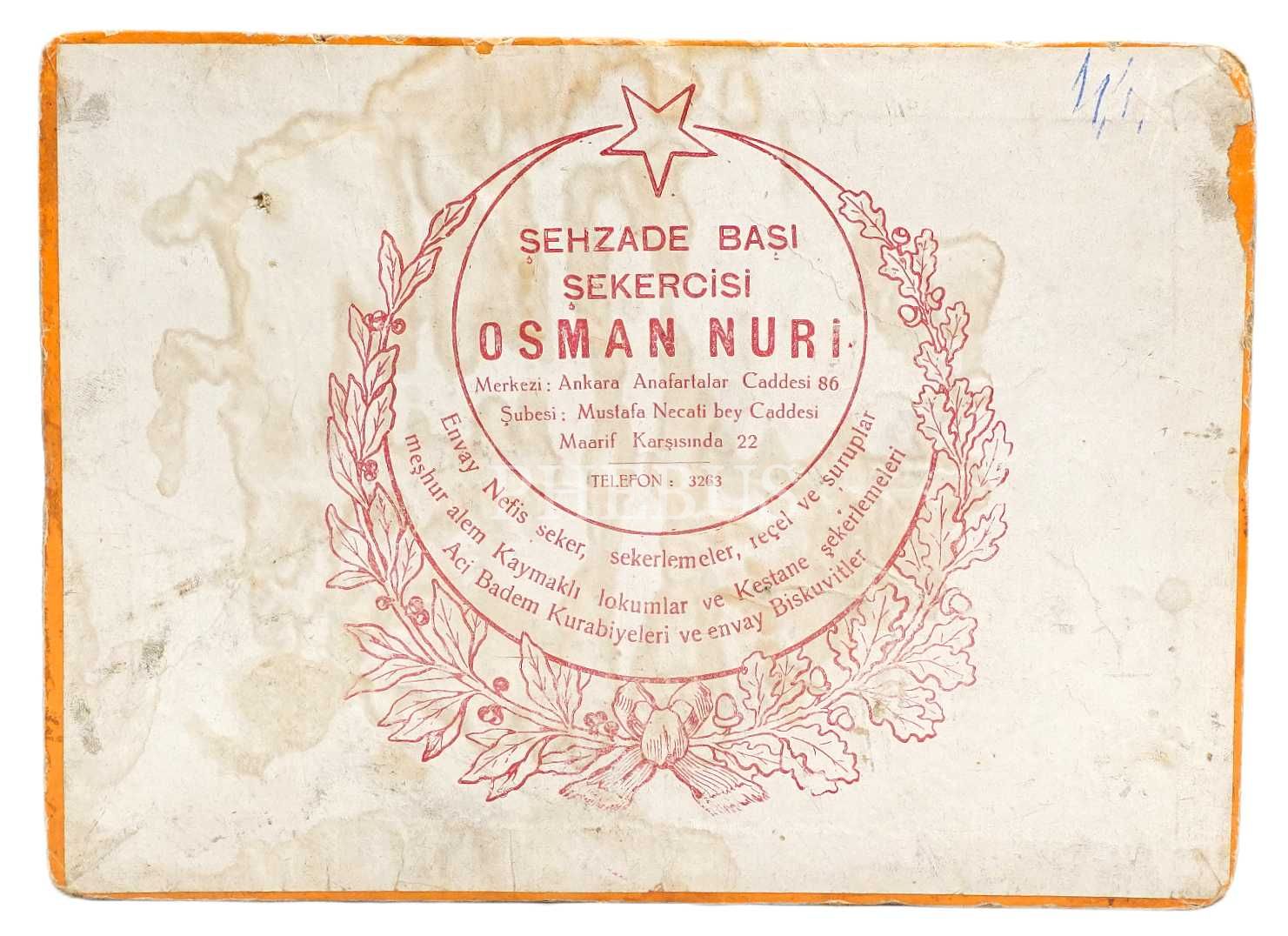 Kapağı "Şehzade Başı Şekercisi OSMAN NURİ" ibareli karton şekerleme kutusu, 22x16x8 cm
