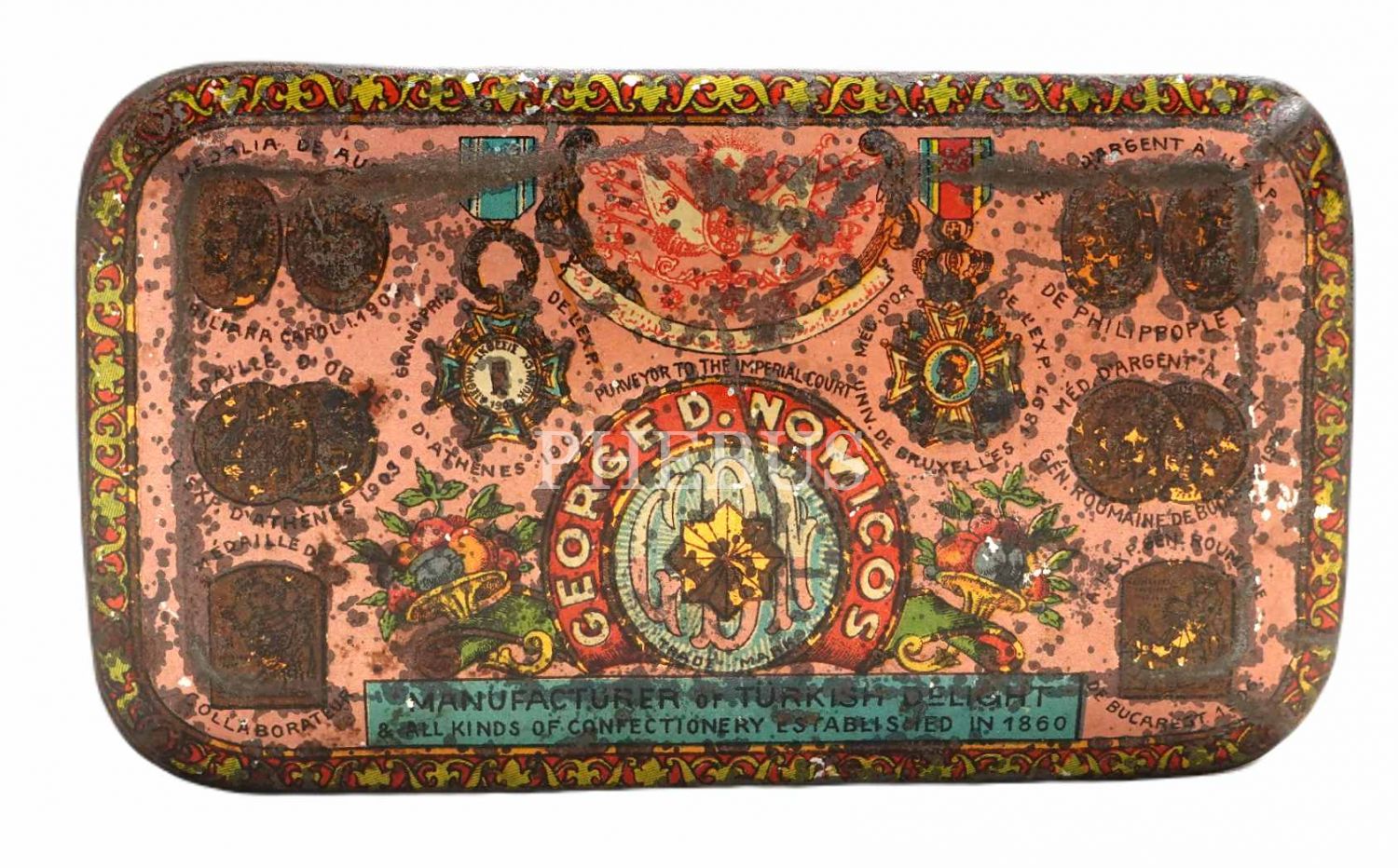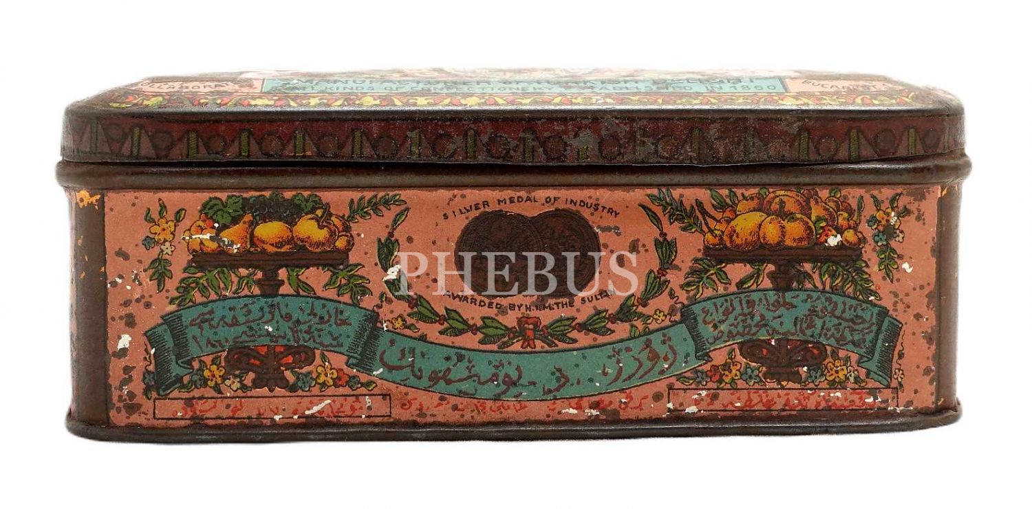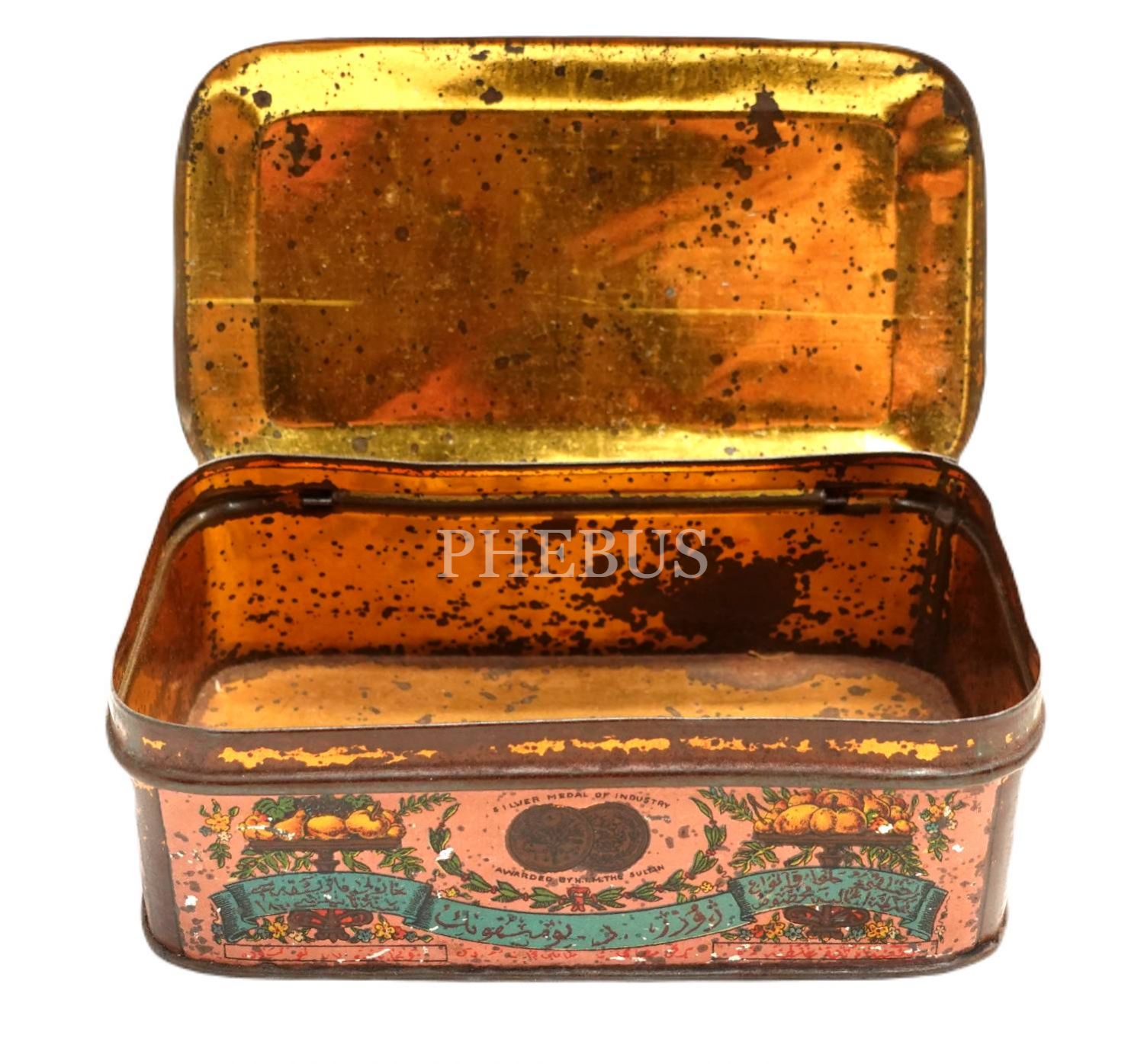 Osmanlıca, Rumca ve Fransızca yazılı, Osmanlı devlet arması görselli "GEORGE D. NOMICOS" marka teneke lokum kutusu, Galata - Constantinople, 12x6x4 cm