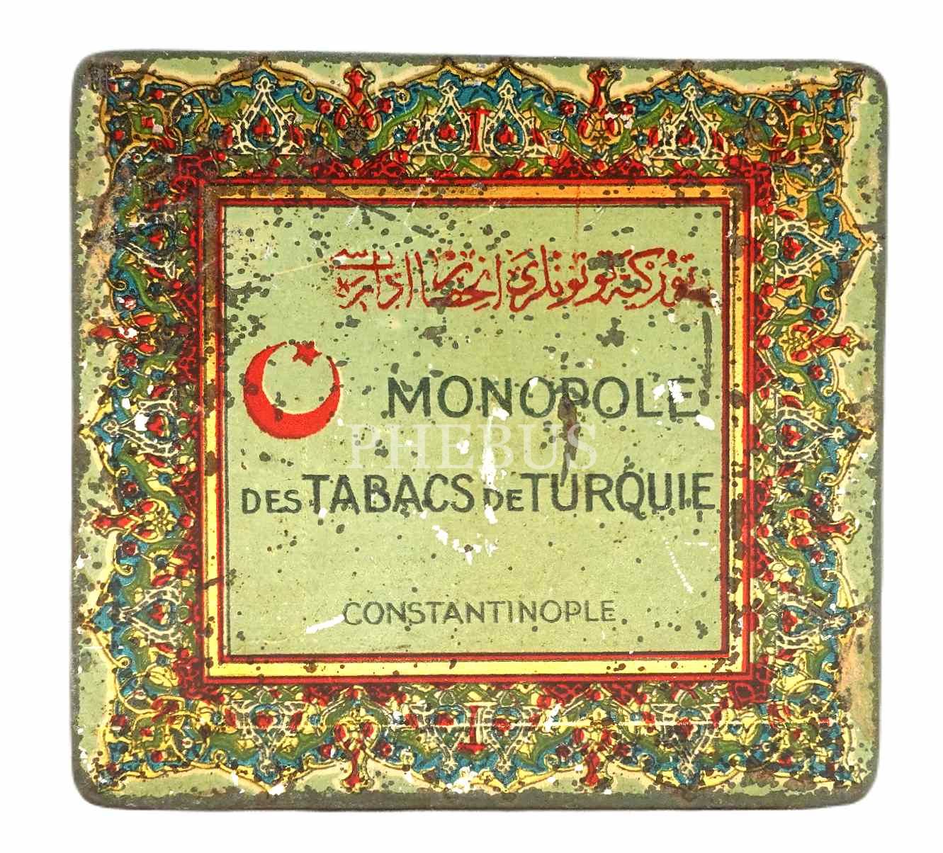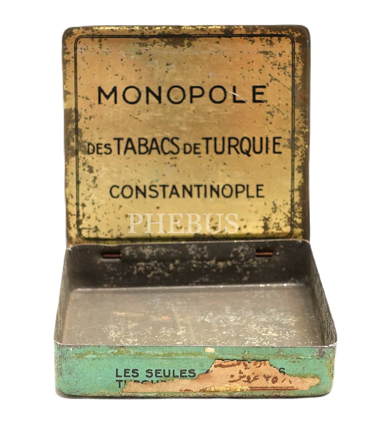Osmanlıca-Fransızca "MONOPOLE DES TABACS DE TURQUIE (Constantinople)" yazılı teneke sigara kutusu, 8x7x2 cm