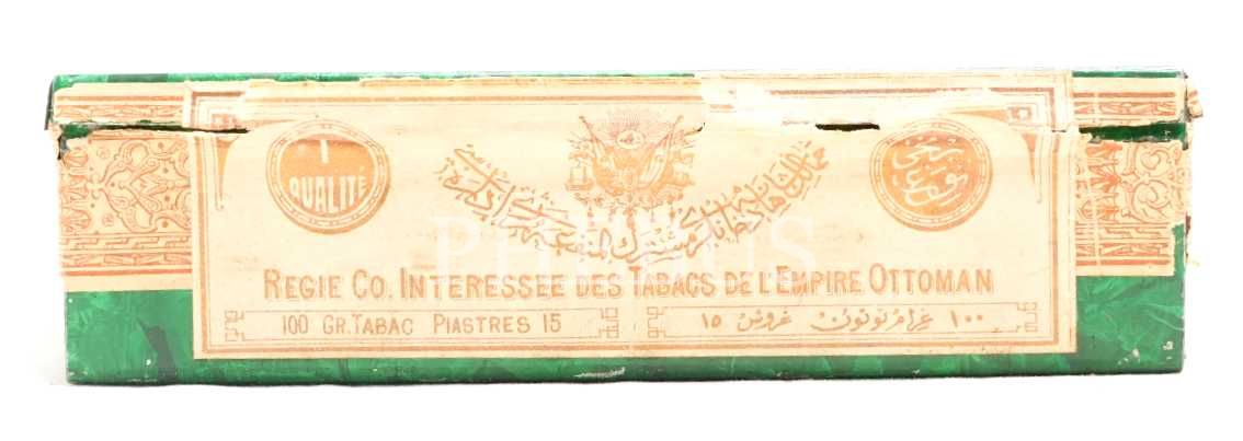 Osmanlıca-Fransızca "REGIE CO. INTERESSE DES TABACS DE L´EMPIRE OTTOMAN" etiketli teneke tütün kutusu (dolu), 16x11x4 cm