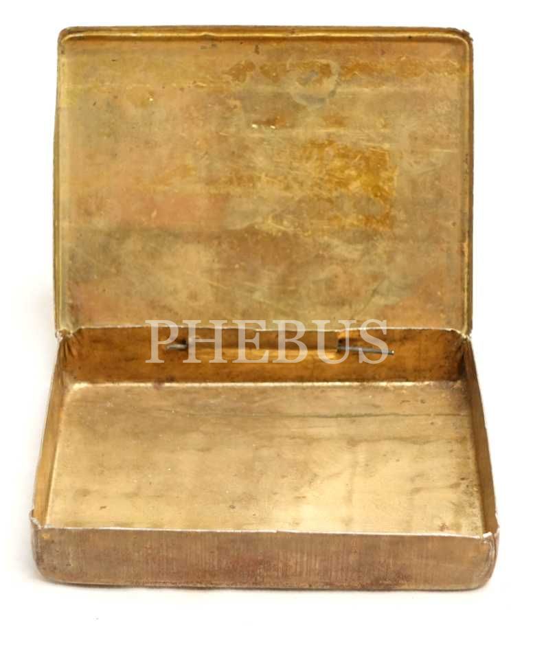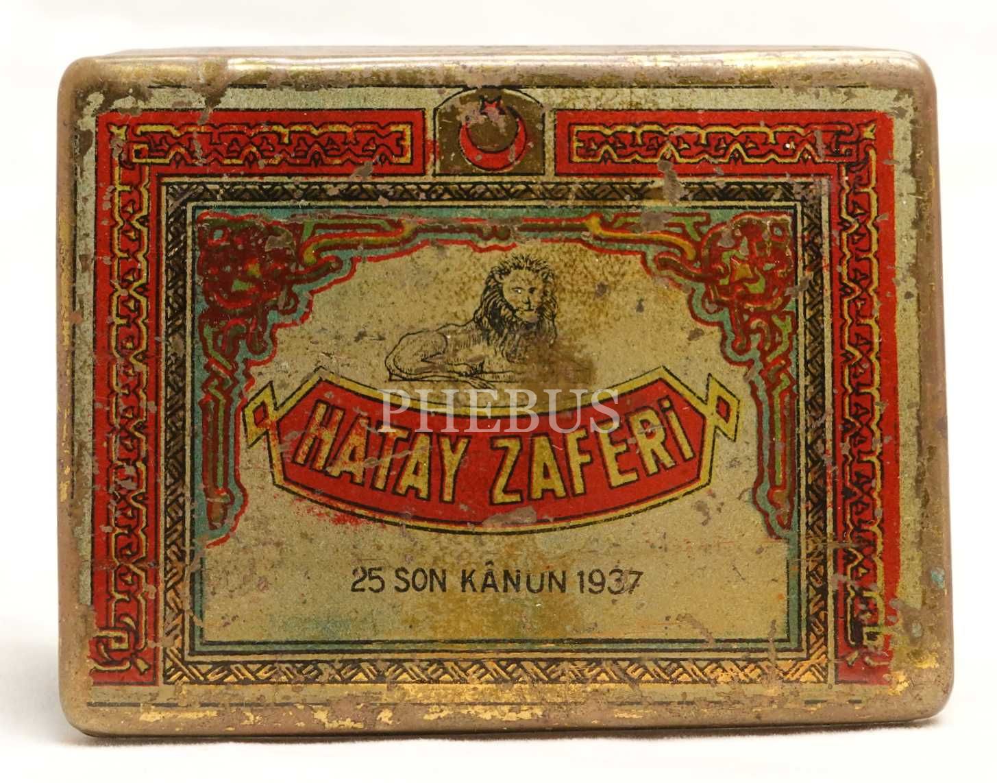 "HATAY ZAFERİ (25 Son Kânun 1937)" yazılı, ay yıldız ve aslan görselli teneke sigara kutusu, 10x7x2 cm