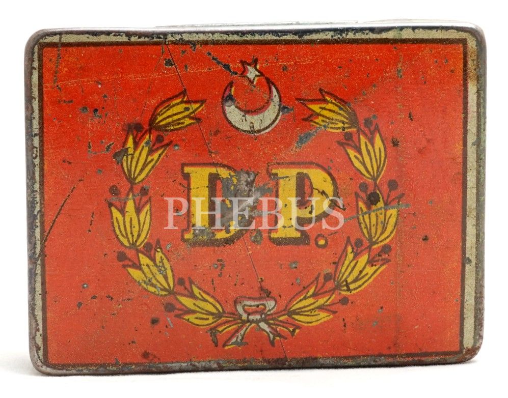"D.P." [Demokrat Parti] logolu ve ay yıldızlı teneke sigara kutusu, 10x7x2 cm