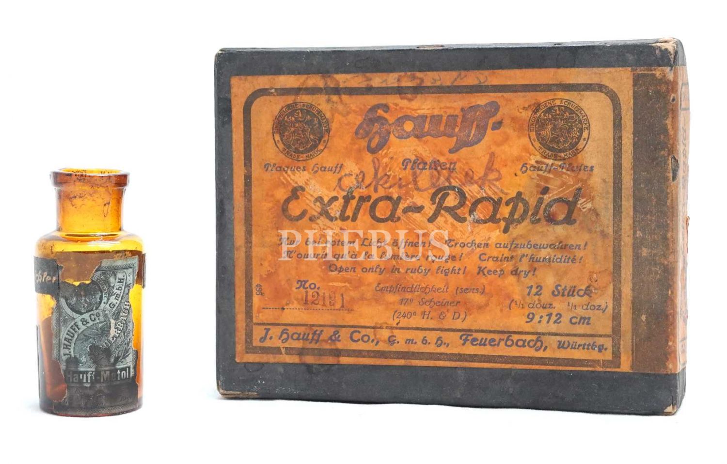 "HAUFF" marka fotoğraf kâğıdı kutusu ve fotoğraf solüsyonu şişesi, 13x10x3 cm & 7x3 cm