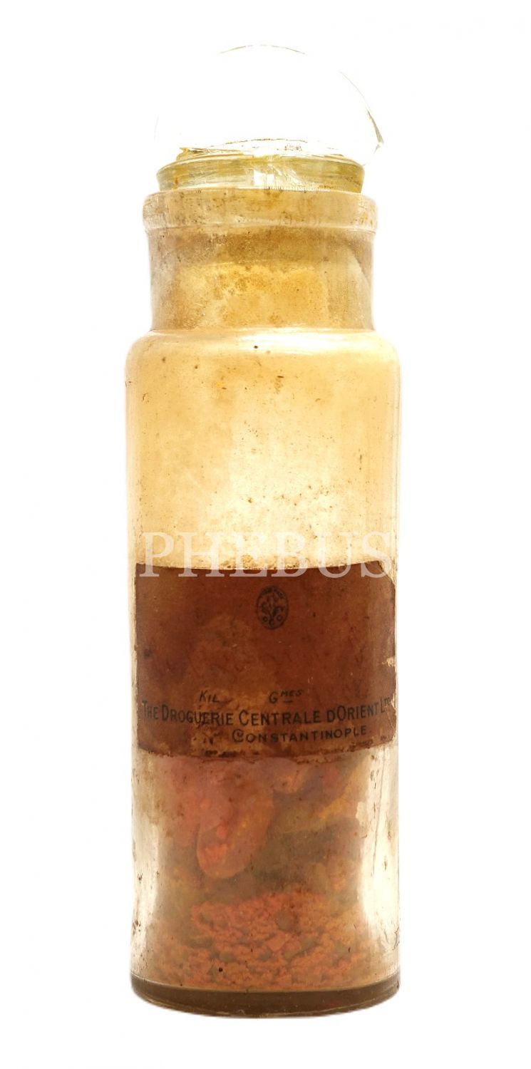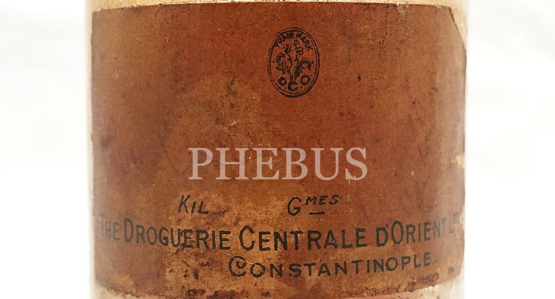 "THE DROGUERIE CENTRALE D´ORIENT LTD. - CONSTANTINOPLE" etiketli dolu ilaç şişesi, 16x4 cm